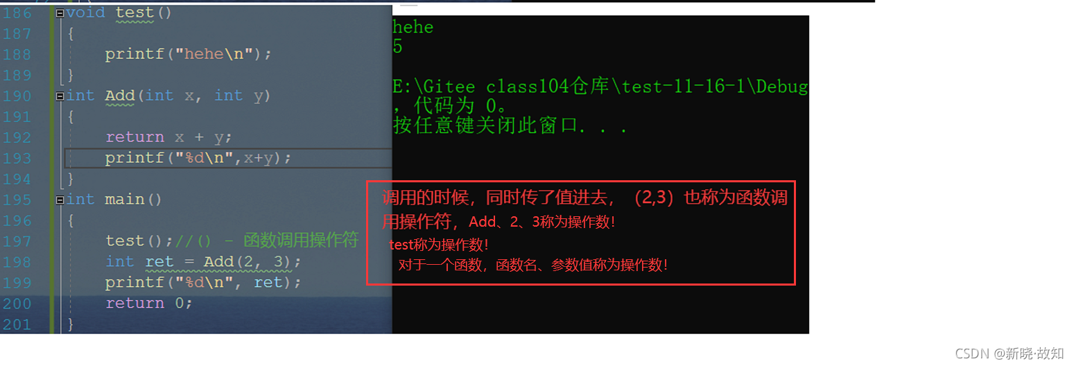 void test() { printf("hehe\n"); } int Add(int x, int y) { return x + y; printf("%d\n",x+y); } int main() { test(); () - 函数调用操作符 int ret = Add(2, 3); printf("%d\n", ret); return 0; }