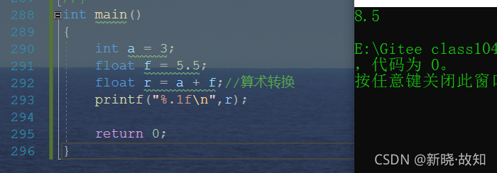 int main() { int a = 3; float f = 5.5; float r = a + f;//算术转换 printf("%.1f\n",r); return 0; }