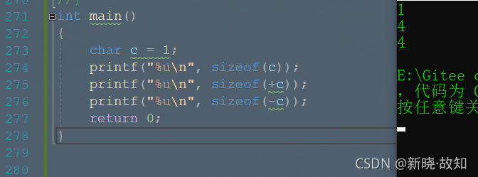 实例2 int main() { char c = 1; printf("%u\n", sizeof(c)); printf("%u\n", sizeof(+c)); printf("%u\n", sizeof(-c)); return 0; }