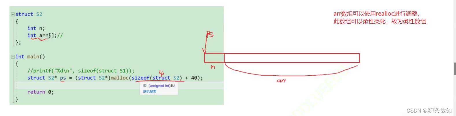 包含柔性数组成员的结构用malloc ()函数进行内存的动态分配,并且分配的内存应该大于结构的大 小,以适应柔性数组的预期大小。