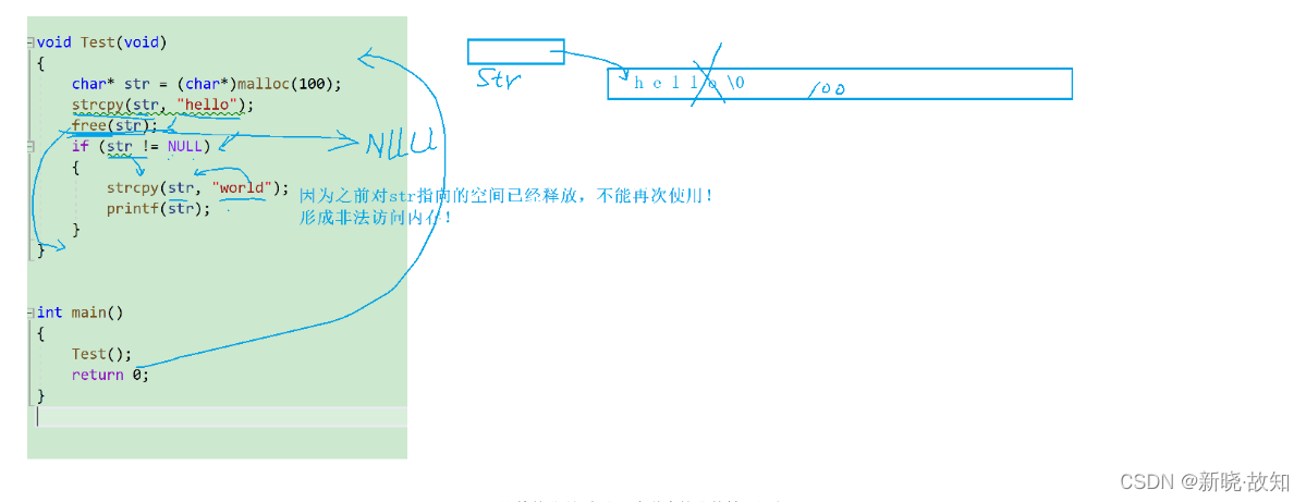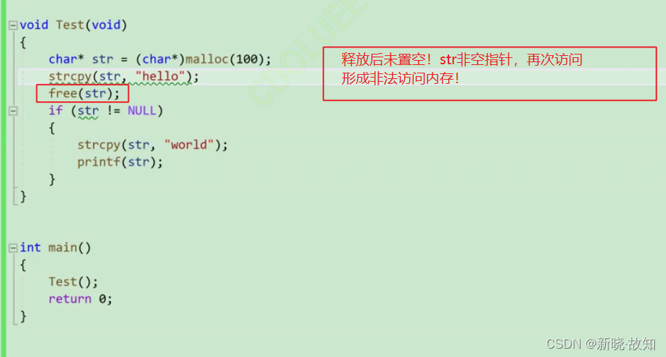 void Test(void) { char* str = (char*)malloc(100); strcpy(str, "hello"); free(str); if (str != NULL) { strcpy(str, "world"); printf(str); } }