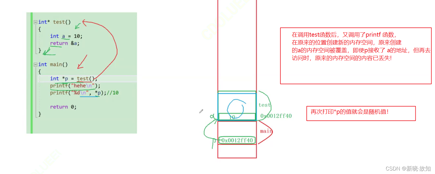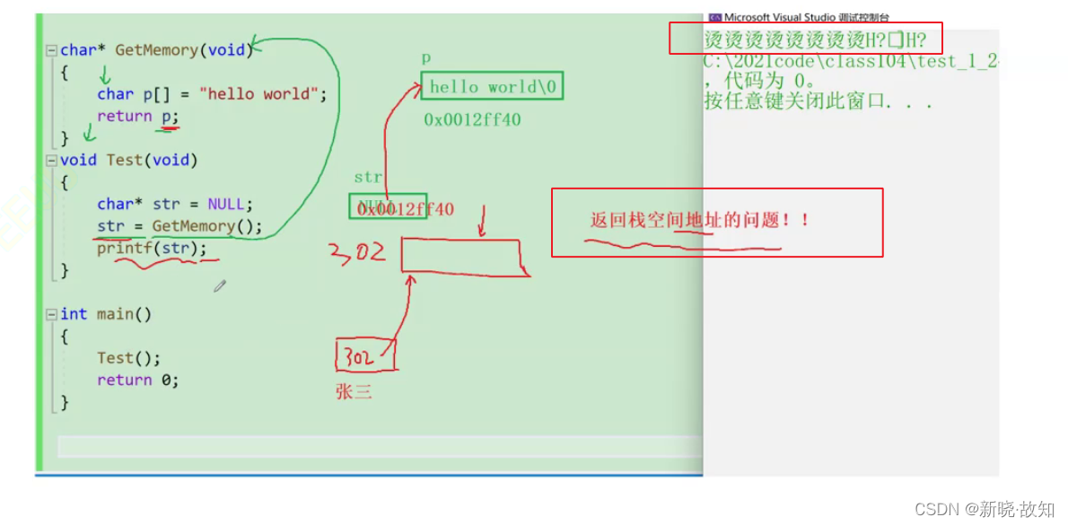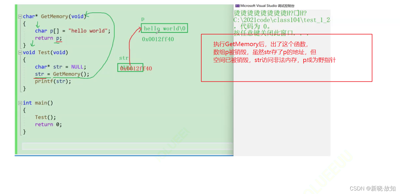 char *GetMemory(void) { char p[] = "hello world"; return p; } void Test(void) { char *str = NULL; str = GetMemory(); printf(str); }