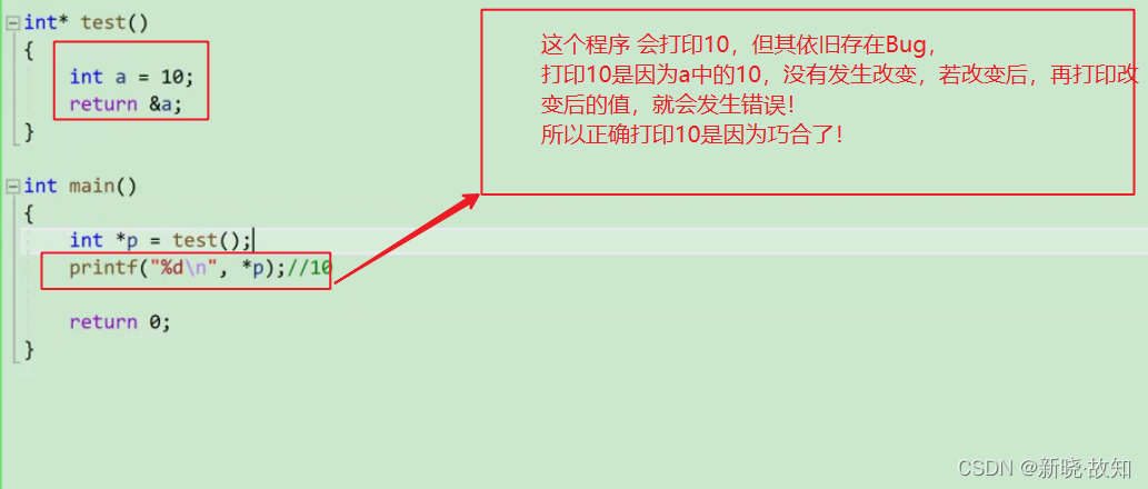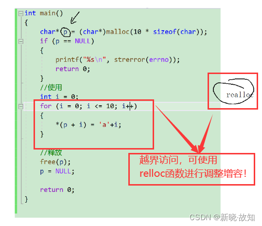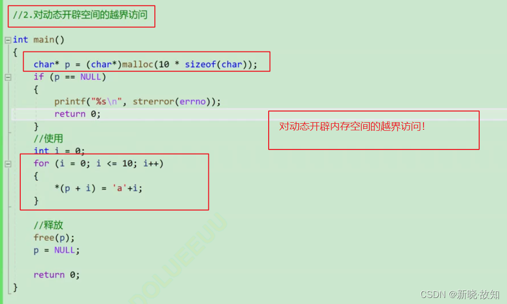 void test() { int i = 0; int *p = (int *)malloc(10*sizeof(int)); if(NULL == p) { exit(EXIT_FAILURE); } for(i=0; i<=10; i++) { *(p+i) = i;//当i是10的时候越界访问 } free(p); }