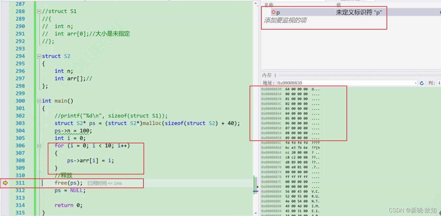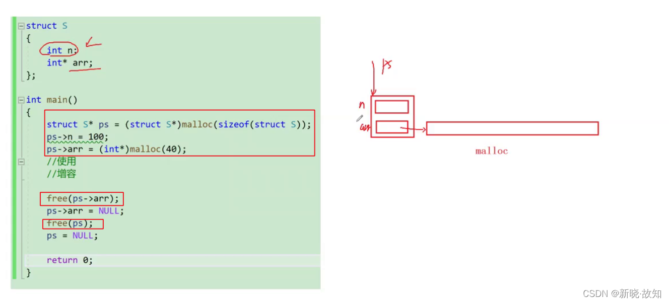 //代码2 typedef struct st_type { int i; int* p_a; }type_a; type_a* p = (type_a*)malloc(sizeof(type_a)); p->i = 100; p->p_a = (int*)malloc(p->i * sizeof(int)); //业务处理 for (i = 0; i < 100; i++) { p->p_a[i] = i; } //释放空间 free(p->p_a); p->p_a = NULL; free(p); p = NULL;