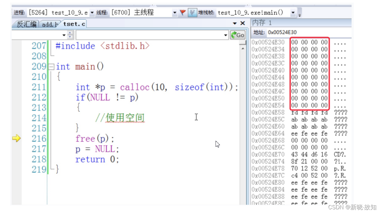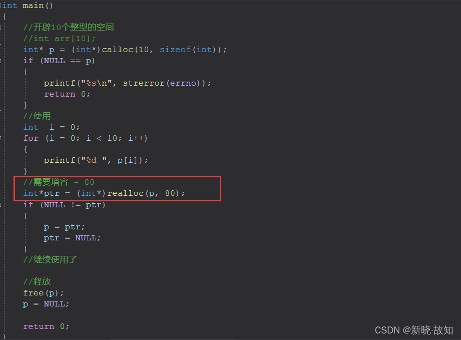 #include <stdio.h> #include <stdlib.h> int main() { int* p = (int*)calloc(10, sizeof(int)); if (NULL != p) { //使用空间 } free(p); p = NULL; return 0; }