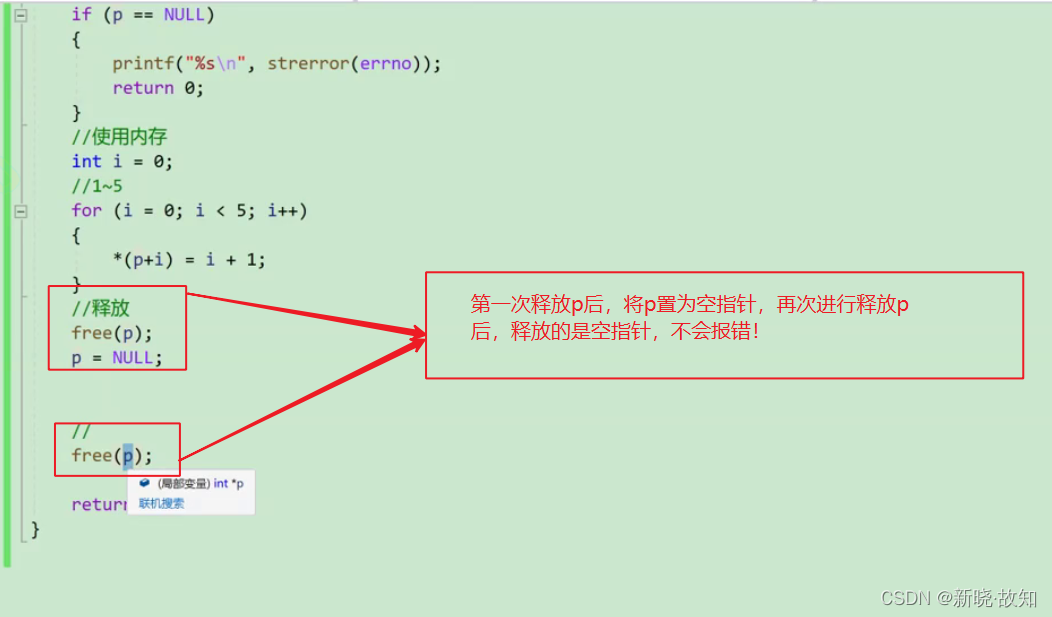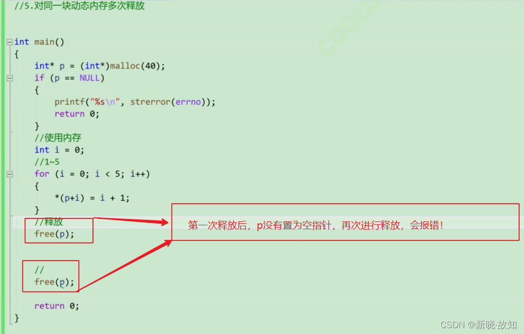 void test() { int *p = (int *)malloc(100); free(p); free(p);//重复释放 }