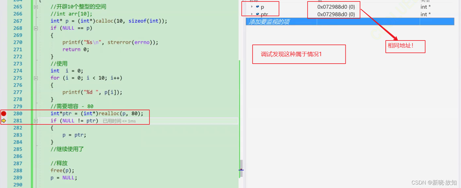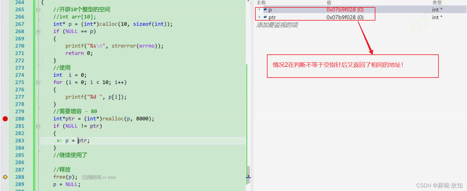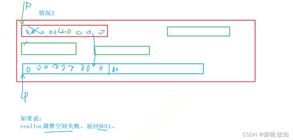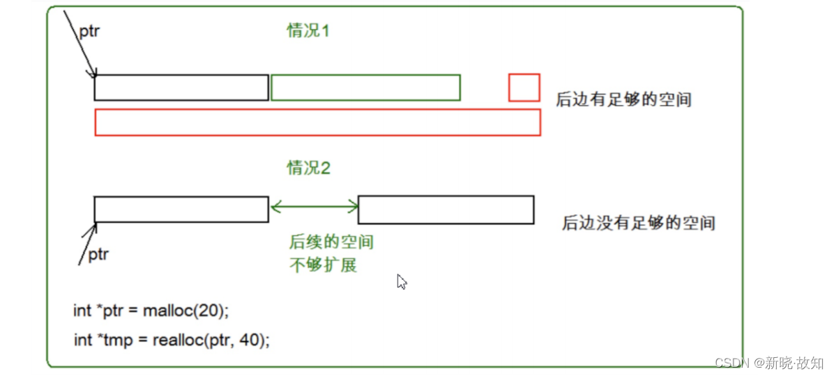 情况2 当是情况2 的时候,原有空间之后没有足够多的空间时,扩展的方法是:在堆空间上另找一个合适大小 的连续空间来使用。这样函数返回的是一个新的内存地址。