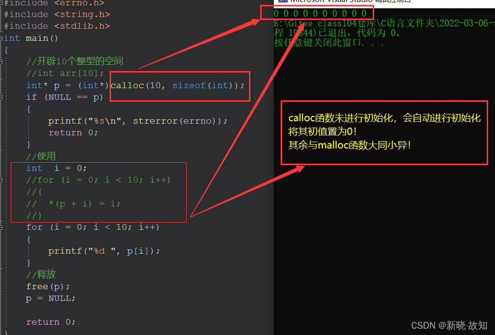 calloc函数若人为没初始化,会自动初始化为0,再返回地址,效率相较而言低。
