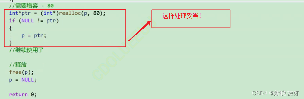 #include <stdio.h> int main() { int *ptr = (int*)malloc(100); if(ptr != NULL) { //业务处理 } else { exit(EXIT_FAILURE); } //扩展容量 //代码1 ptr = (int*)realloc(ptr, 1000);//这样可以吗?(如果申请失败会如何?) //代码2 int*p = NULL; p = realloc(ptr, 1000); if(p != NULL) { ptr = p; } //业务处理 free(ptr); return 0; }