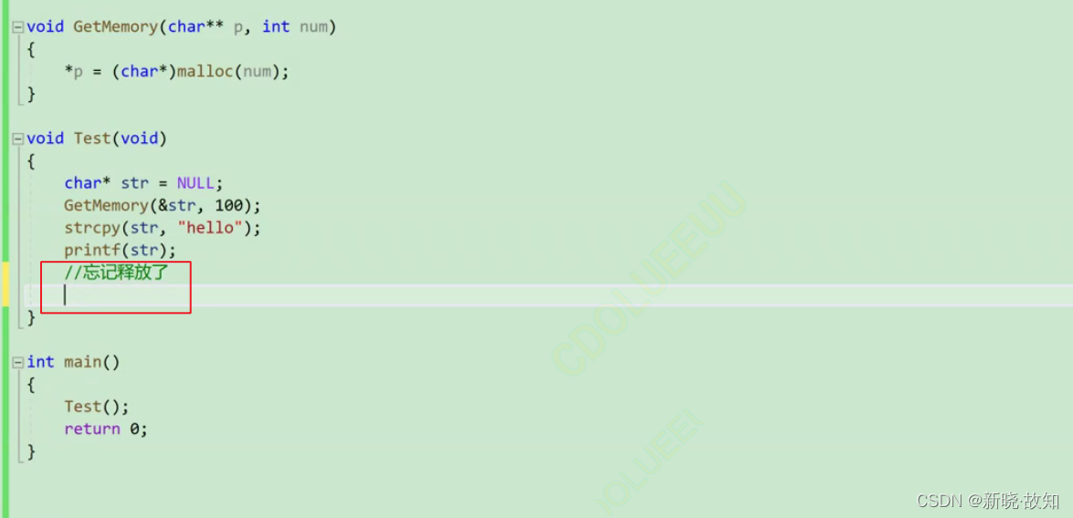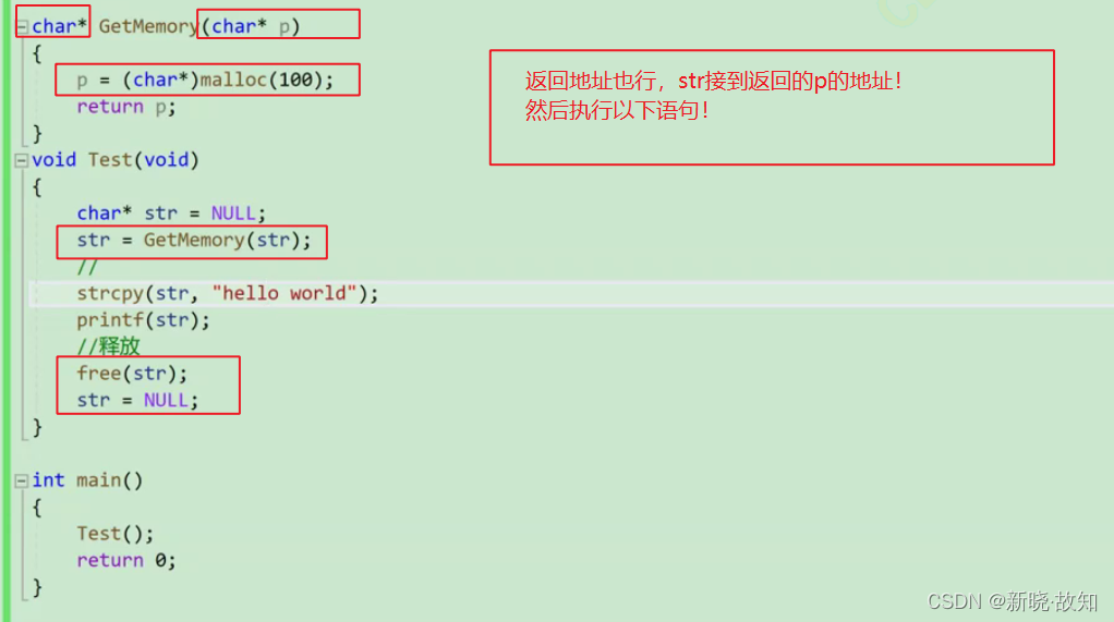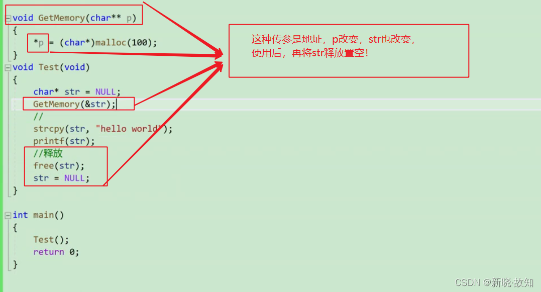 void GetMemory(char** p, int num) { *p = (char*)malloc(num); } void Test(void) { char* str = NULL; GetMemory(&str, 100); strcpy(str, "hello"); printf(str); }
