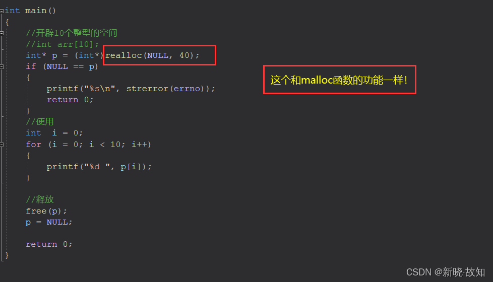int main() { //开辟10个整型的空间 //int arr[10]; int* p = (int*)realloc(NULL, 40); if (NULL == p) { printf("%s\n", strerror(errno)); return 0; } //使用 int i = 0; for (i = 0; i < 10; i++) { printf("%d ", p[i]); } //释放 free(p); p = NULL; return 0; }
