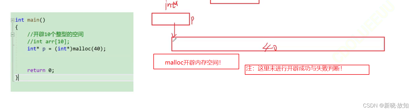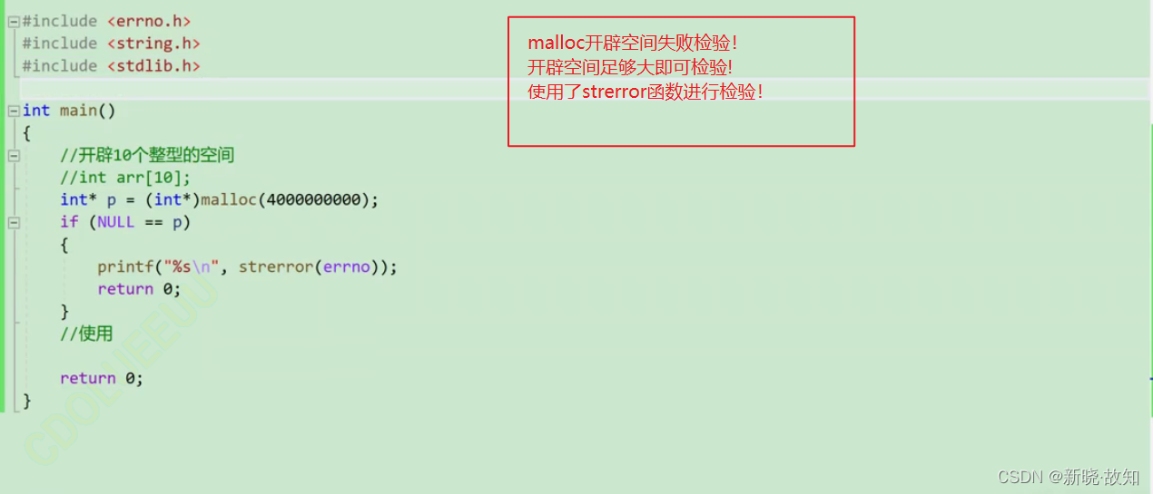 如果开辟失败,则返回一个NULL指针,因此malloc的返回值一定要做检查。