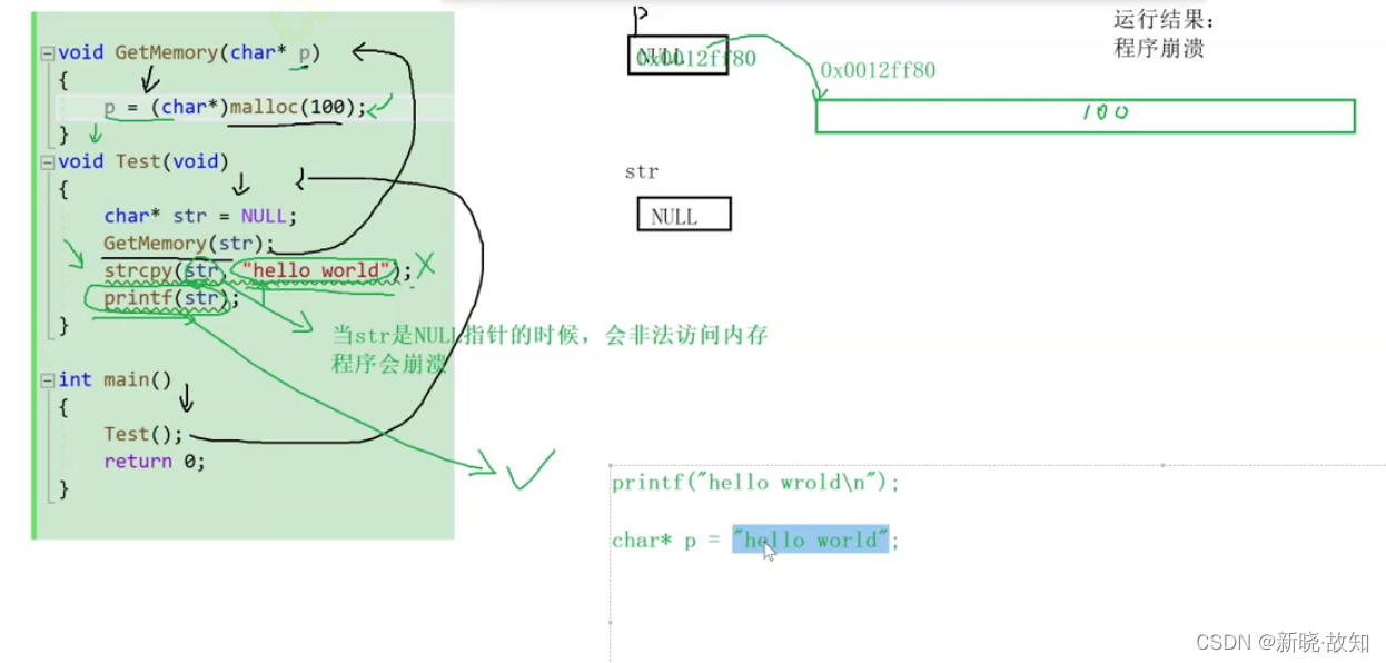 ,p可以指向其空间,但未对p的合法性(返回值)判断,p是形参,除了作用域,malloc没释放,p被销毁,找不到了开辟的空间,p的改变不影响str,strcpy把“hello world”拷贝放在空指针里,形成了非法访问内存。