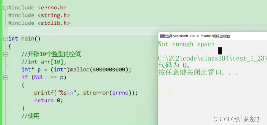 #include <errno.h> #include <string.h> #include <stdlib.h> int main() { //开辟10个整型的空间 //int arr[10]; int* p = (int*)malloc(40); if (NULL == p) { printf("%s\n", strerror(errno)); return 0; } //使用 int i = 0; for (i = 0; i < 10; i++) { *(p + i) = i; } for (i = 0; i < 10; i++) { printf("%d ", p[i]); } //释放 free(p); p = NULL; return 0; }