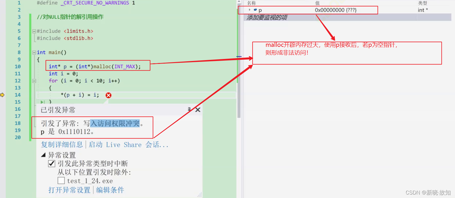 void test() { int *p = (int *)malloc(INT_MAX/4); *p = 20;//如果p的值是NULL,就会有问题 free(p); }