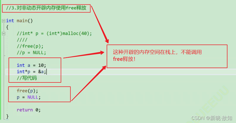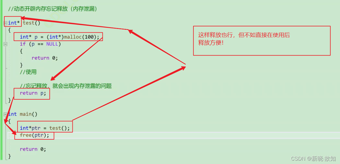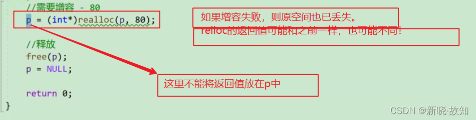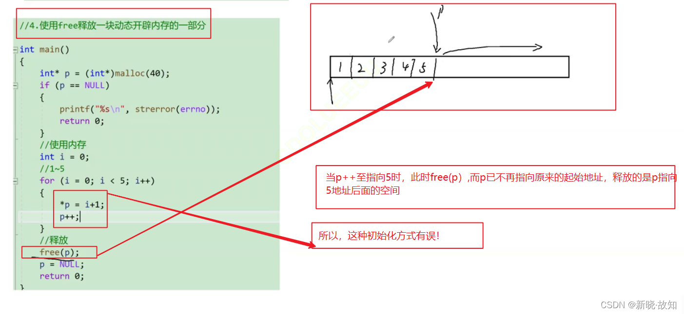 在释放动态内存空间时,无法做到释放一部分!造成内存泄漏!因此必须将原来的地址保存使用其他指针或者再返回原来的地址!