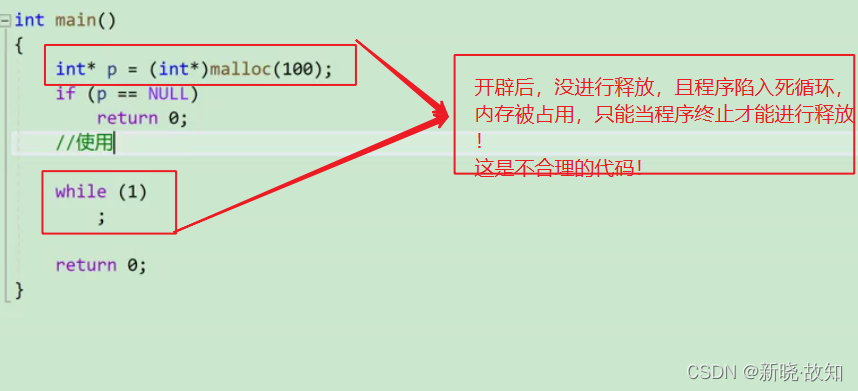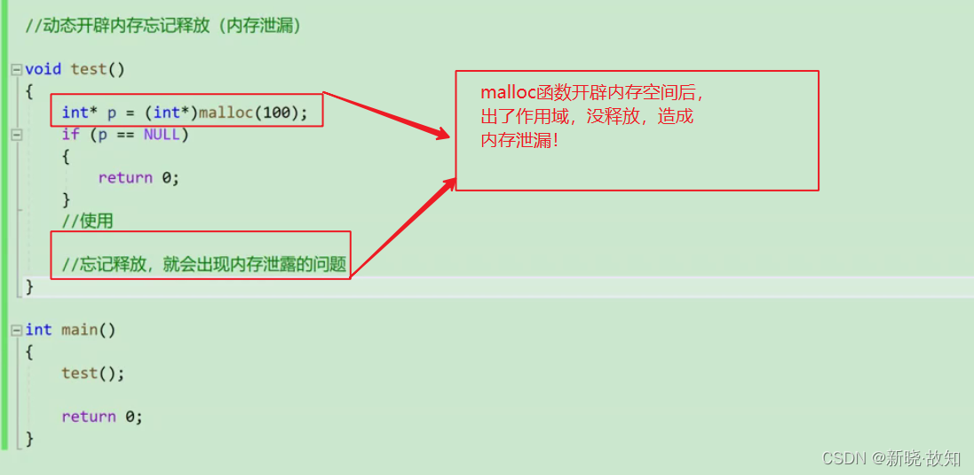 忘记释放不再使用的动态开辟的空间会造成内存泄漏。