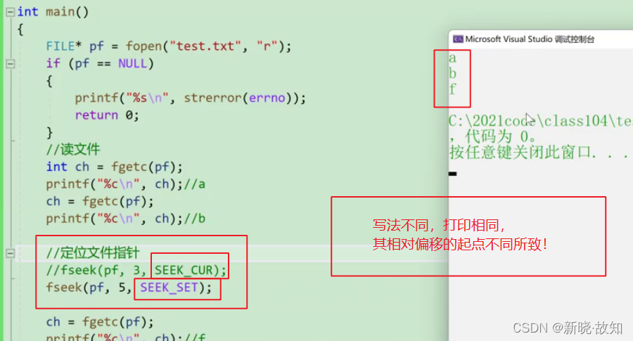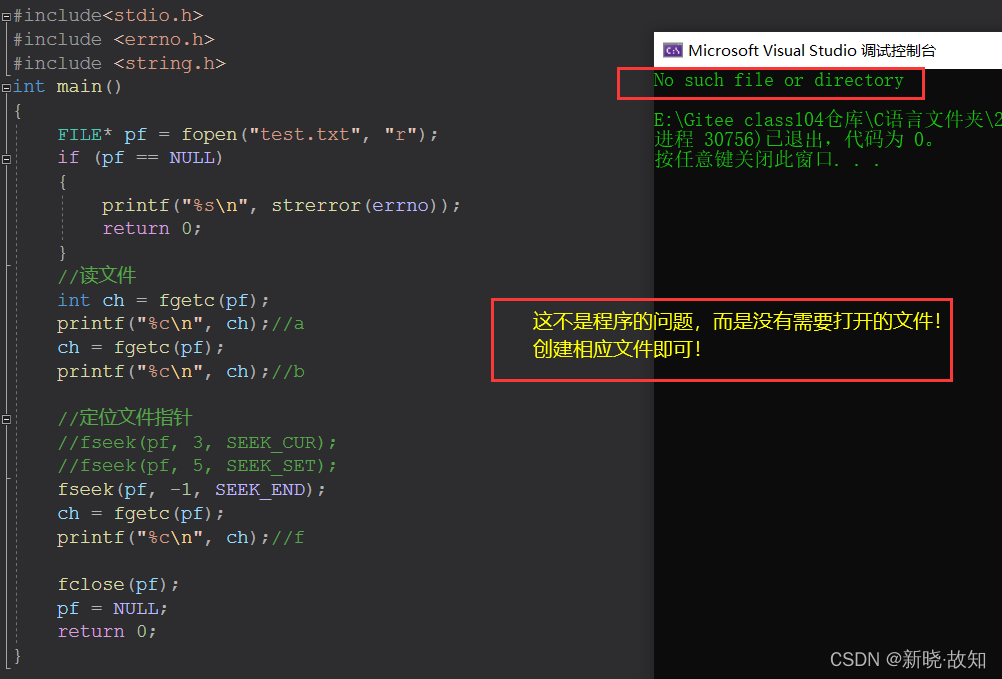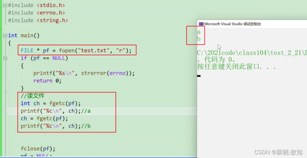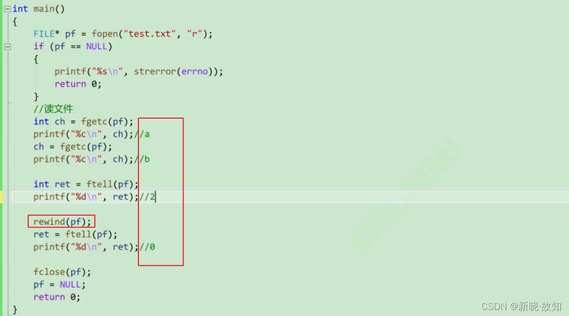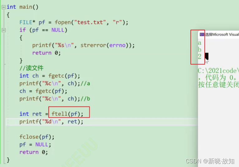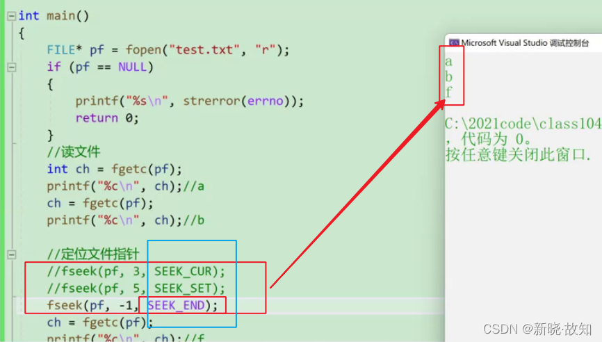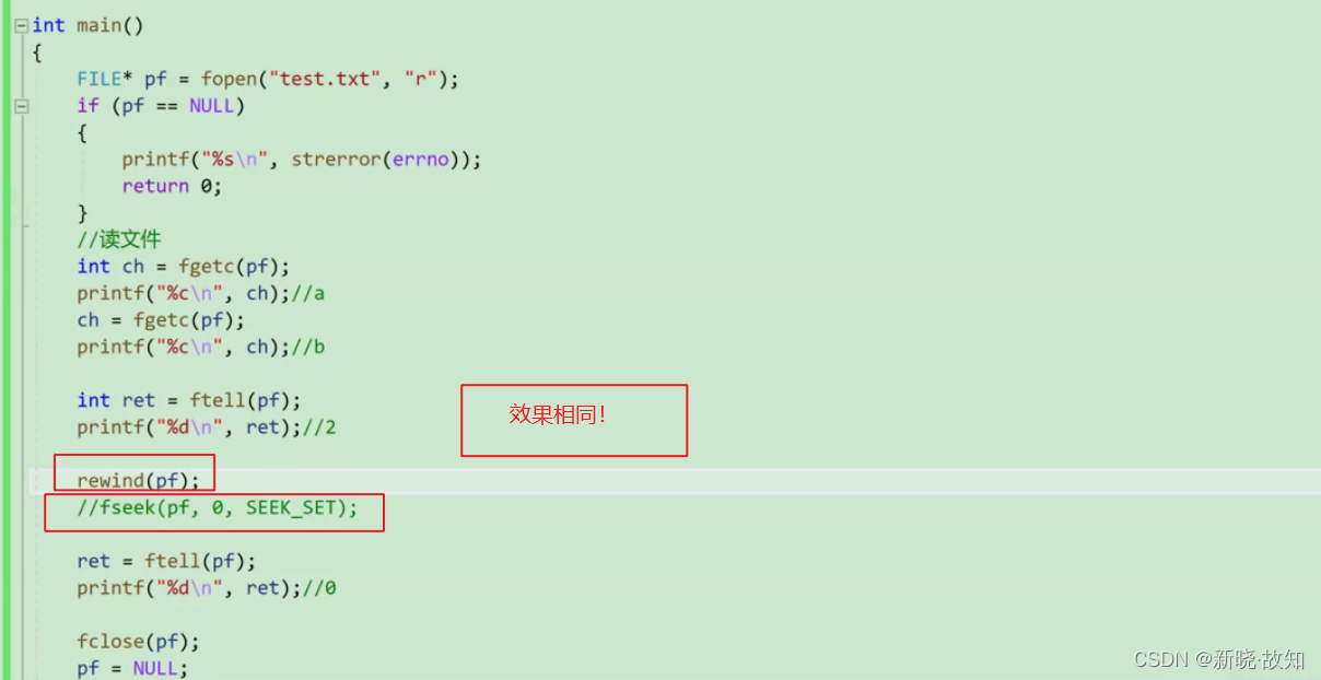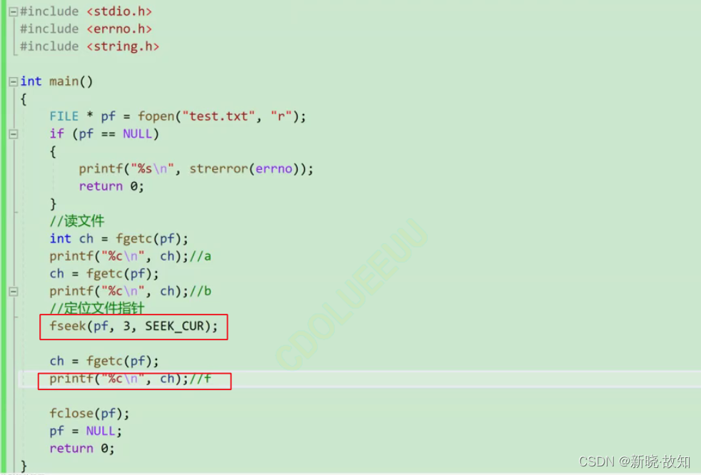 #include<stdio.h> #include <errno.h> #include <string.h> int main() { FILE* pf = fopen("test.txt", "r"); if (pf == NULL) { printf("%s\n", strerror(errno)); return 0; } //读文件 int ch = fgetc(pf); printf("%c\n", ch);//a ch = fgetc(pf); printf("%c\n", ch);//b //定位文件指针 //fseek(pf, 3, SEEK_CUR); //fseek(pf, 5, SEEK_SET); fseek(pf, -1, SEEK_END); ch = fgetc(pf); printf("%c\n", ch);//f fclose(pf); pf = NULL; return 0; }