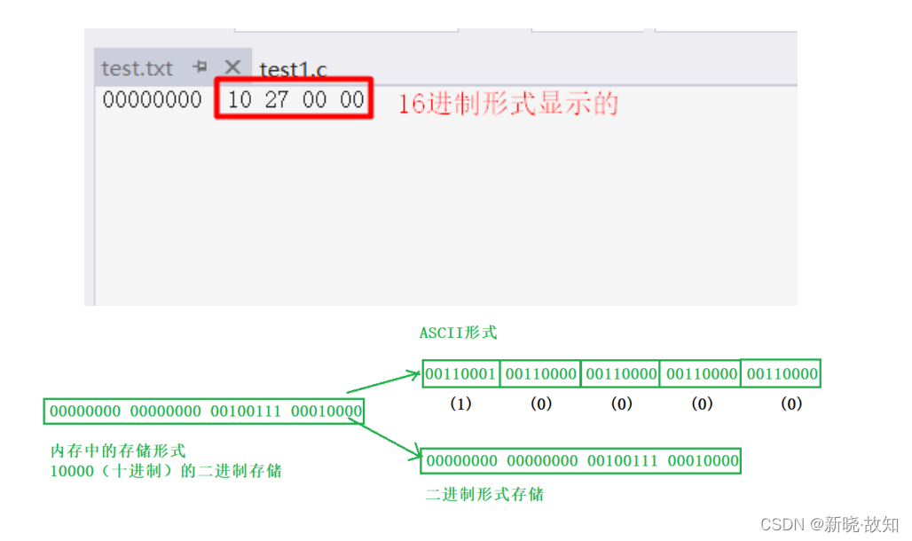 #include <stdio.h> int main() { int a = 10000; FILE* pf = fopen("test.txt", "wb"); fwrite(&a, 4, 1, pf);//二进制的形式写到文件中 fclose(pf); pf = NULL; return 0; }