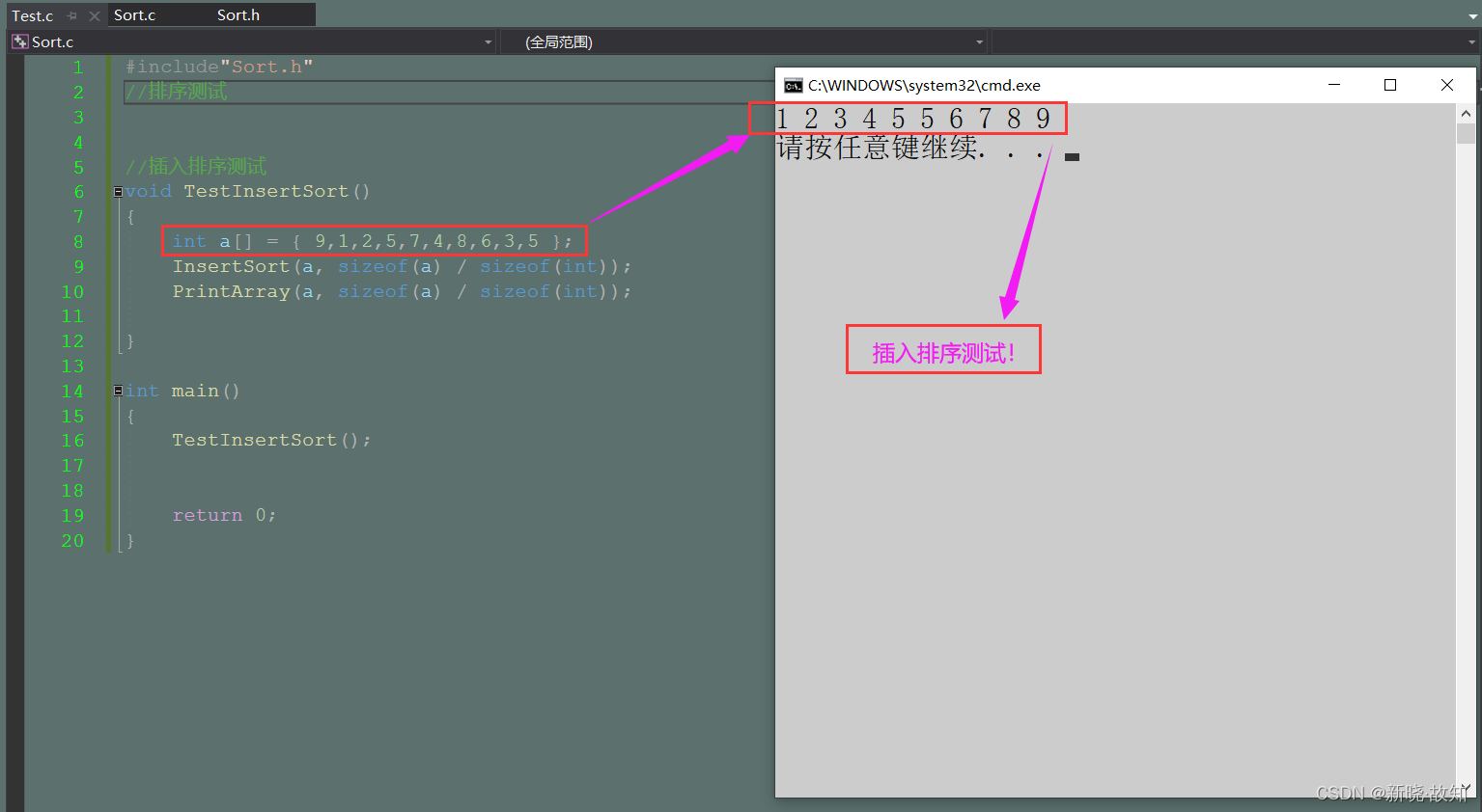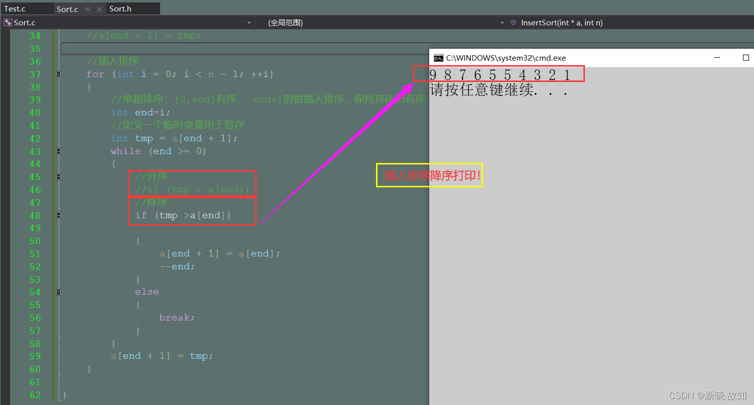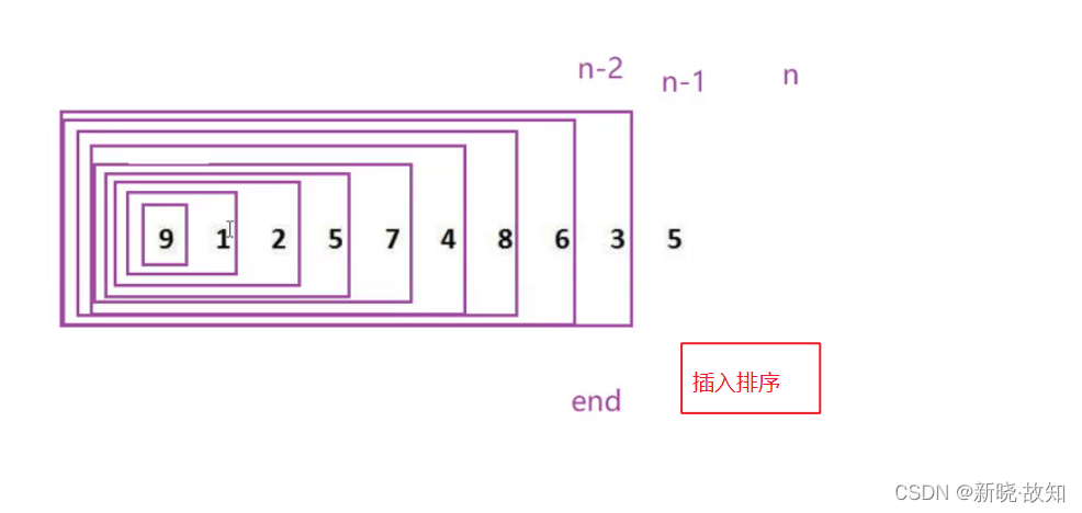 //插入排序 //时间复杂度:O(N^2) //最好情况:原数据有序或接近有序 //最差情况:原有顺序与将要的排序逆序 void InsertSort(int* a, int n) { ////单趟排序:[0,end]有序, end+1的值插入排序,保持其依旧有序 //int end; ////定义一个临时变量用于暂存 //int tmp = a[end + 1]; //while (end >= 0) //{ // if (tmp < a[end]) // { // a[end + 1] = a[end]; // --end; // } // else // { // break; // } //} //a[end + 1] = tmp; //插入排序—在单趟的基础,加上循环 for (int i = 0; i < n - 1; ++i) { //单趟排序:[0,end]有序, end+1的值插入排序,保持其依旧有序 int end=i; //定义一个临时变量用于暂存 int tmp = a[end + 1]; while (end >= 0) { //升序 if (tmp <a[end]) //降序 //if (tmp >a[end]) { a[end + 1] = a[end]; --end; } else { break; } } a[end + 1] = tmp; } }