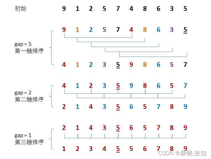 先选定一个整数,把待排序文件中所有记录分成个组,所有距离为的记录分在同一组内,并对每一组内的记录进行排序。然后,取,重复上述分组和排序的工作。当到达=1时,所有记录在统一组内排好序。
