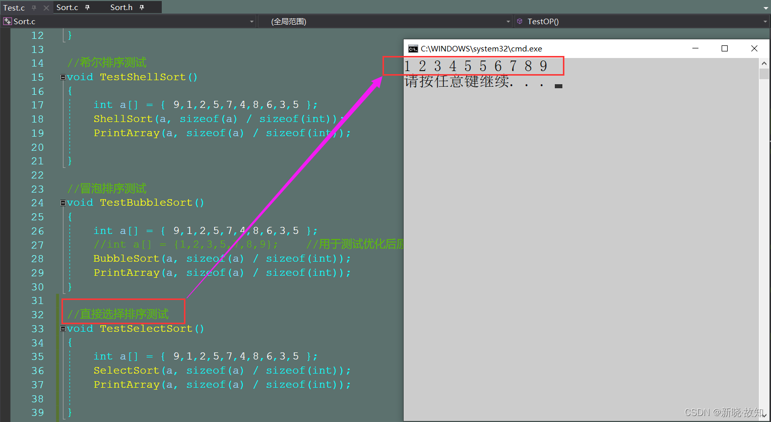 //直接选择排序 void SelectSort(int* a, int n) { int left = 0, right = n - 1; while (left < right) { int min = left, max = left; //这里只要给一个初始值即可 for (int i = left + 1; i <= right; ++i) { if (a[i] < a[min]) { min = i; } if (a[i] > a[max]) { max = i; } } Swap(&a[left], &a[min]); //如果left和max重叠,修正以下即可 if (left == max) { max = min; } Swap(&a[right], &a[max]); left++; right--; } }