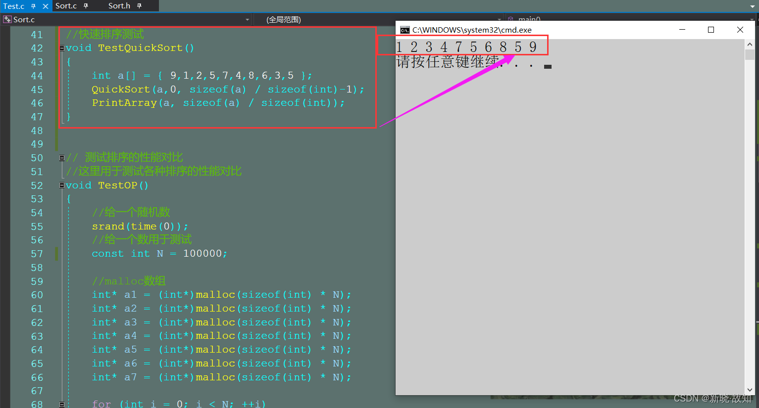 //快排key取值优化 //1.随机取key //2.三数取中 int GetMidIndex(int* a, int left, int right) { //int mid = (left + right) / 2; //防溢出 int mid = left + (right - left) / 2; //left mid right if (a[left] < a[mid]) { if (a[mid] < a[right]) { return mid; } else if (a[left] > a[right]) { return left; } else { return right; } } else //a[left]>a[mid] { if (a[mid] > a[right]) { return mid; } else if (a[left] < a[right]) { return left; } else { return right; } } } //快速排序—hoare版PartSort1 //单趟排序1 //缺陷:1.例如:遇到 5 5 2 3 5 //既不大也不小,会死循环 在找小,找大的while循环判断中加上<=、>= //2.但加上<=、>=会造成越界,对找小,找大的while循环判断更改 //注意边界问题 int PartSort1(int* a, int left, int right) { int mid = GetMidIndex(a, left, right); Swap(&a[mid], &a[left]); int key = left; while (left < right) { //找小 //缺点1:while (a[right] > a[key]) //缺点2:while (a[right] >= a[key]) while (left<right && a[right] >= a[key]) --right; //找大 //缺点1:while (a[left] < a[key]) //缺点2:while (a[left] <= a[key]) while (left<right && a[left] <= a[key]) ++left; Swap(&a[left], &a[right]); } Swap(&a[key], &a[left]); return left; } //快速排序—挖坑法PartSort2 //单趟排序2 int PartSort2(int* a, int left, int right) { int mid = GetMidIndex(a, left, right); Swap(&a[mid], &a[left]); int key = a[left]; //坑位 int pit = left; while (left < right) { //先移动右边,找到比key小的值 while (left<right&&a[right]>=key) { --right; } a[pit] = a[right]; pit = right; //再移动左边,找到比key大的值 while (left < right && a[left] <= key) { ++left; } a[pit] = a[left]; pit = left; } a[pit] = key; return pit; } //快速排序—前后两个指针法PartSort3 //单趟排序3 int PartSort3(int* a, int left, int right) { //写法1:使用左指针作为key //int mid = GetMidIndex(a, left, right); //Swap(&a[mid], &a[left]); int key = left; int prev = left, cur = left + 1; while (cur <= right) { if (a[cur] < a[key] && a[++prev] != a[cur]) Swap(&a[prev], &a[cur]); ++cur; } Swap(&a[prev], &a[key]); return prev; //写法2:使用右指针作为key //调试快速排序非递归时,注释此语句,因为调用参数取中,就不符合栈的逻辑 //int mid = GetMidIndex(a, left, right); //Swap(&a[mid], &a[right]); /*int key = right; int prev = left-1, cur = left; while (cur<right) { if (a[cur] < a[key] && a[++prev] != a[cur]) Swap(&a[prev], &a[cur]); ++cur; } Swap(&a[++prev], &a[key]); return prev;*/ } //快速排序 void QuickSort(int* a, int begin,int end) { //子区间相等只有一个值或者不存在那么就是递归结束的子问题 if (begin >= end) return; //int key = PartSort1(a, begin, end); //int key = PartSort2(a, begin, end); int key = PartSort3(a, begin, end); //[begin,key-1] key[key+1,end] QuickSort(a, begin, key - 1); QuickSort(a, key + 1, end); } //快速排序——小区间优化 //void QuickSort(int* a, int begin, int end) //{ // //子区间相等只有一个值或者不存在那么就是递归结束的子问题 // if (begin >= end) // return; // //小区间直接插入排序控制有序 // if (end - begin +1<=10) // { // InsertSort(a+begin, end - begin + 1); // } // else // { // //int key = PartSort1(a, begin, end); // //int key = PartSort2(a, begin, end); // int key = PartSort3(a, begin, end); // // //[begin,key-1] key[key+1,end] // QuickSort(a, begin, key - 1); // QuickSort(a, key + 1, end); // } // //} //快速排序——非递归实现 //非递归的本质是借助栈模拟递归 void QuickSortNonR(int* a, int begin, int end) { ST st; StackInit(&st); StackPush(&st, begin); StackPush(&st, end); while (!StackEmpty(&st)) { int right = StackTop(&st); StackPop(&st); int left = StackTop(&st); StackPop(&st); //单趟排序——三种单趟排序选哪个均可 //int key = PartSort1(a, left, right); //int key = PartSort2(a, left, right); int key = PartSort3(a, left, right); // [left,key-1][key+1,right] if (left < key - 1) { StackPush(&st, left); StackPush(&st, key - 1); } if (key + 1 < right) { StackPush(&st, key+ 1); StackPush(&st, right); } } StackDestroy(&st); }