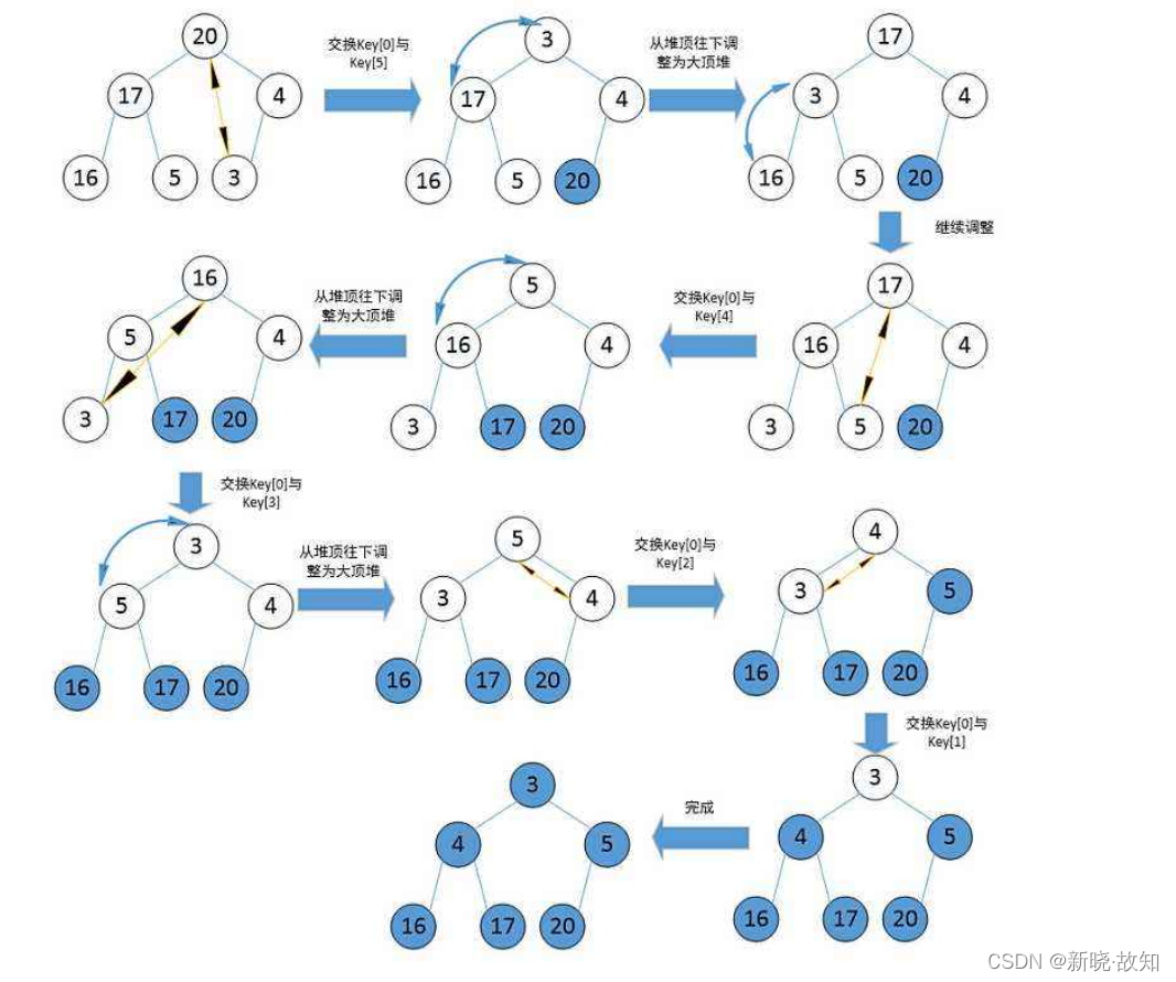 //堆排序-1++ //优化:建堆 //时间复杂度:O(N* logN)、 //空间复杂度:O(1) //直接在原数组建堆 //堆—向下调整 //向下调整要放在堆排序的前面—与调用顺序有关 void AdjustDown(int* a, size_t size, size_t root) { size_t parent = root; size_t child = parent * 2 + 1; while (child < size) { //1.选出左右孩子中小的那个 //小堆-升序 //if (child + 1 < size && a[child +1] < a[child]) //大堆-降序 //if (child + 1 < size && a[child + 1] >a[child]) //升序要建大堆(根据建堆分析) if (child + 1 < size && a[child + 1] > a[child]) { ++child; } //2.如果孩子小于父亲,则交换,并继续向下调整 //if (a[child] < a[parent]) //小堆-升序 //if (a[child] > a[parent]) //大堆-降序 //升序要建大堆(根据建堆分析) if (a[child] > a[parent]) { Swap(&a[child], &a[parent]); parent = child; child = parent * 2 + 1; } else { break; } } } void HeapSort(int* a, int n) { ////建堆1.——向上调整 时间复杂度:O(N* logN) //for (int i = 1; i < n;++i) //{ // AdjustUp(a, i); //} //建堆2.——向下调整 时间复杂度:O(N) //不能直接建堆,因为向下调整函数功能有要求 //从倒数第一个非叶子结点(最后一个叶子结点的父亲)开始 for (int i = (n - 1 - 1) / 2; i >= 0; --i) { AdjustDown(a, n, i); } //交换调整 size_t end = n - 1; while (end > 0) { Swap(&a[0], &a[end]); AdjustDown(a, end, 0); --end; } }