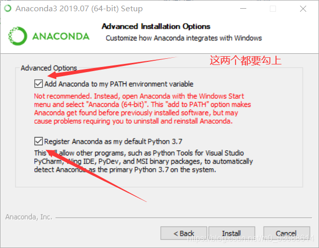 5.接下来勾选这两个选项(第一个选项是把Anaconda添加的环境变量中,第二个是选择最新的python3.7版本)