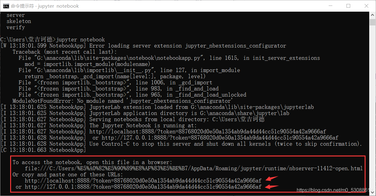 3.在dos中输入jupyter notebook 就能使用编辑器了,当然在使用时不能关闭dos窗口.若想关闭jupyter notebook可以输入ctrl+c关闭.