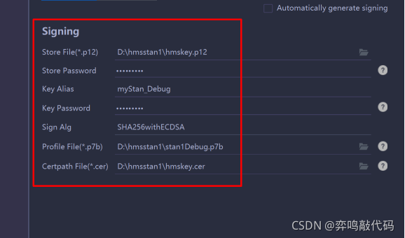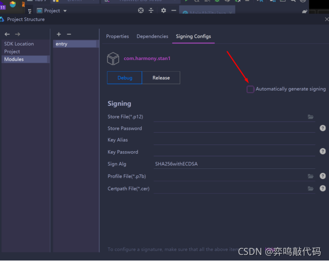 在File > Project Structure > Project > Signing Configs > Release窗口中,配置工程的签名信息。