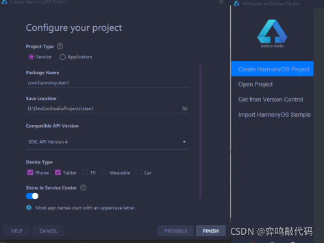 在开发工具里先创建一个工程,这里需要注意的是Package Name !!!必须记住它,因为后面要用到,实在怕忘记,最好用文档记录下来,我这里勾选了两项Device Type,看你们需要勾选就行了。
