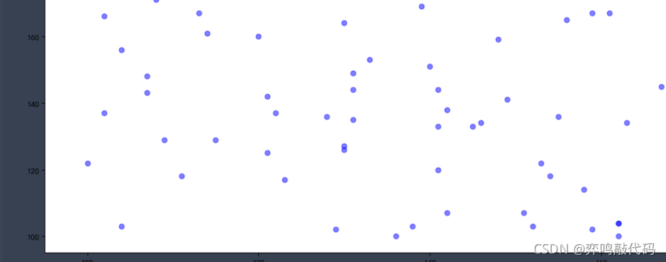import pandas as pd import numpy as np data = np.random.randint(100, 200, size=(100, 2)) df = pd.DataFrame(data,columns=['身高', '体重']) df.sort_index(level=0)# 设置图形大小 plt.figure(figsize=(20,8),dpi=80) # 使用scatter绘制散点图 plt.scatter(df['身高'],df['体重'],alpha=0.5,c='blue') plt.show()