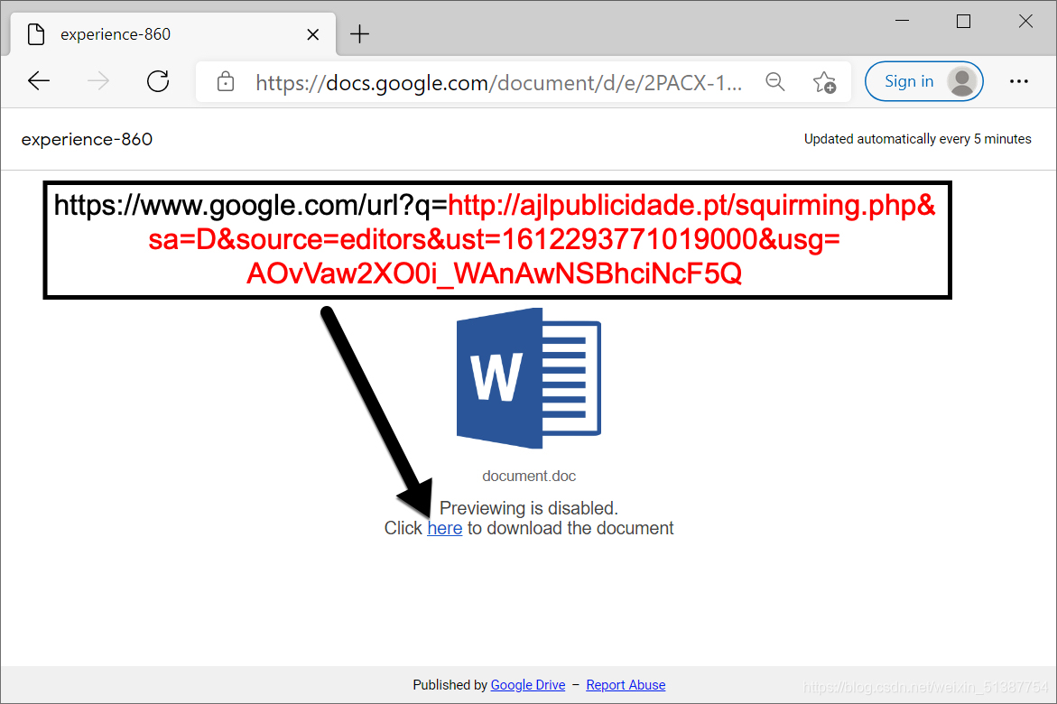这个恶意的Google Drive URL显示了一个网页,其中包含下载Word文档的链接。