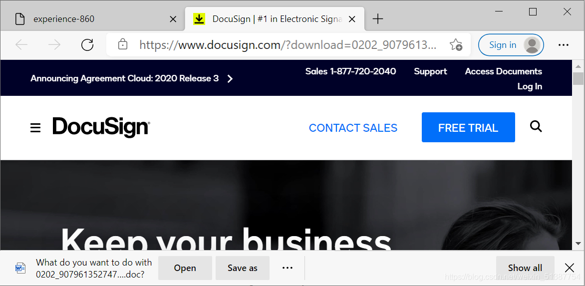 黑色箭头指示要由Web浏览器保存的Word文档的名称,以及Web浏览器重定向到DocuSign URL的位置。