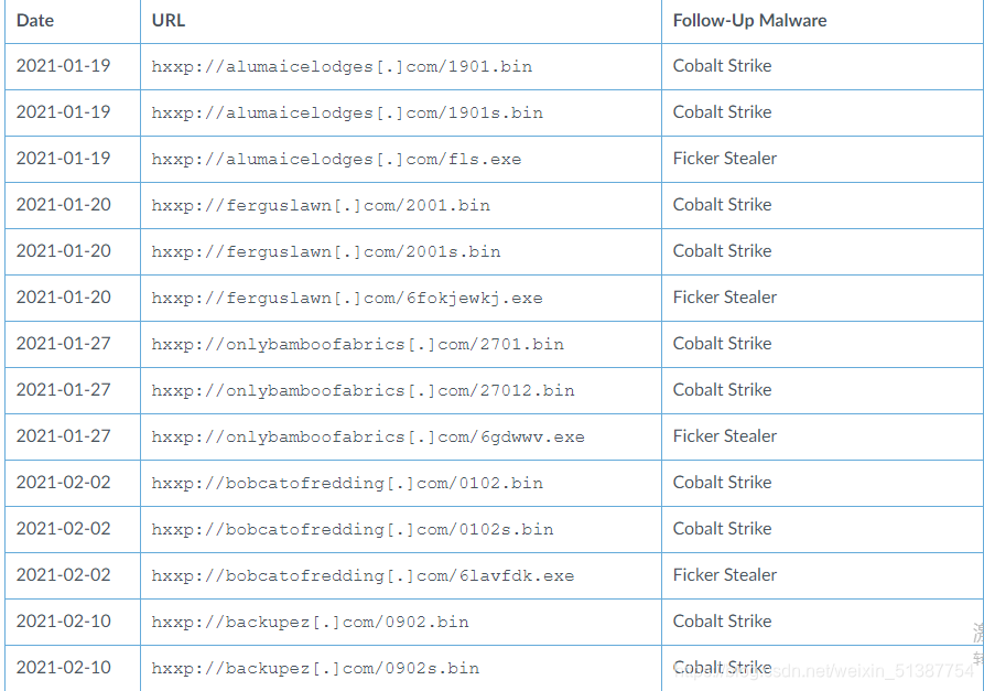 从2020年10月到2021年3月的三个与Hancitor感染相关的Ficker Stealer恶意软件样本的信息,该信息可在此GitHub存储库中找到。https://github.com/pan-unit42/iocs-Hancitor/blob/main/APPENDIX-D-Samples-of-Ficker-Stealer-Associated-With-Hancitor.txt