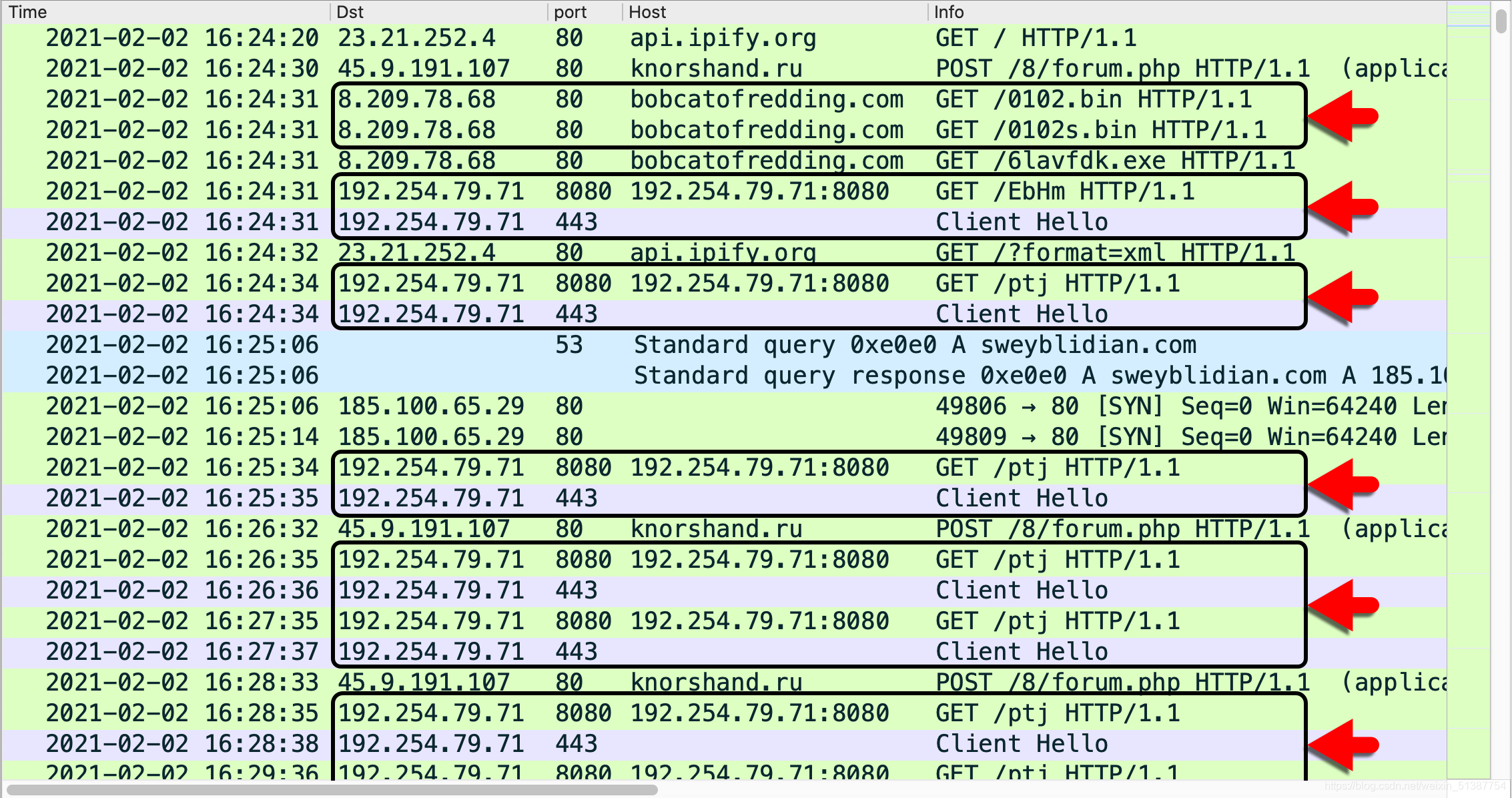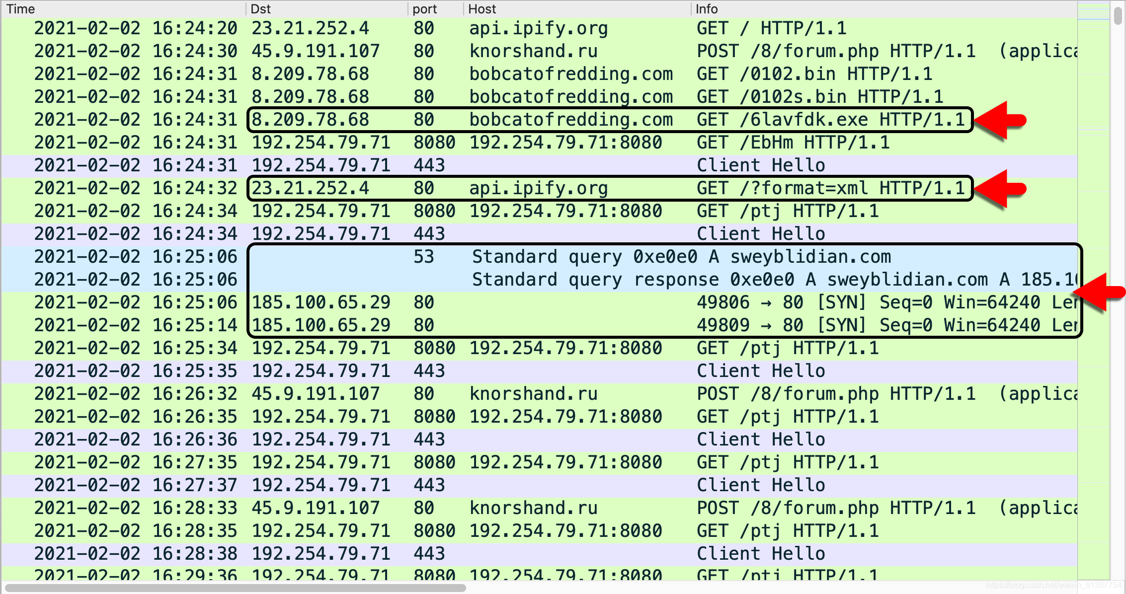 由Hancitor引起的网络流量首先由受感染的Windows主机检查IP地址,然后是C2流量,如该Wireshark列显示中所示。