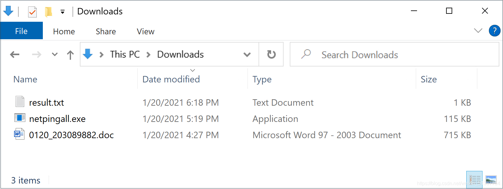 在将用于Hancitor的Word文档保存到磁盘后大约52分钟,出现了用于网络ping工具的EXE。网络ping工具出现后大约59分钟,扫描结果被保存到名为result.txt的文本文件中。