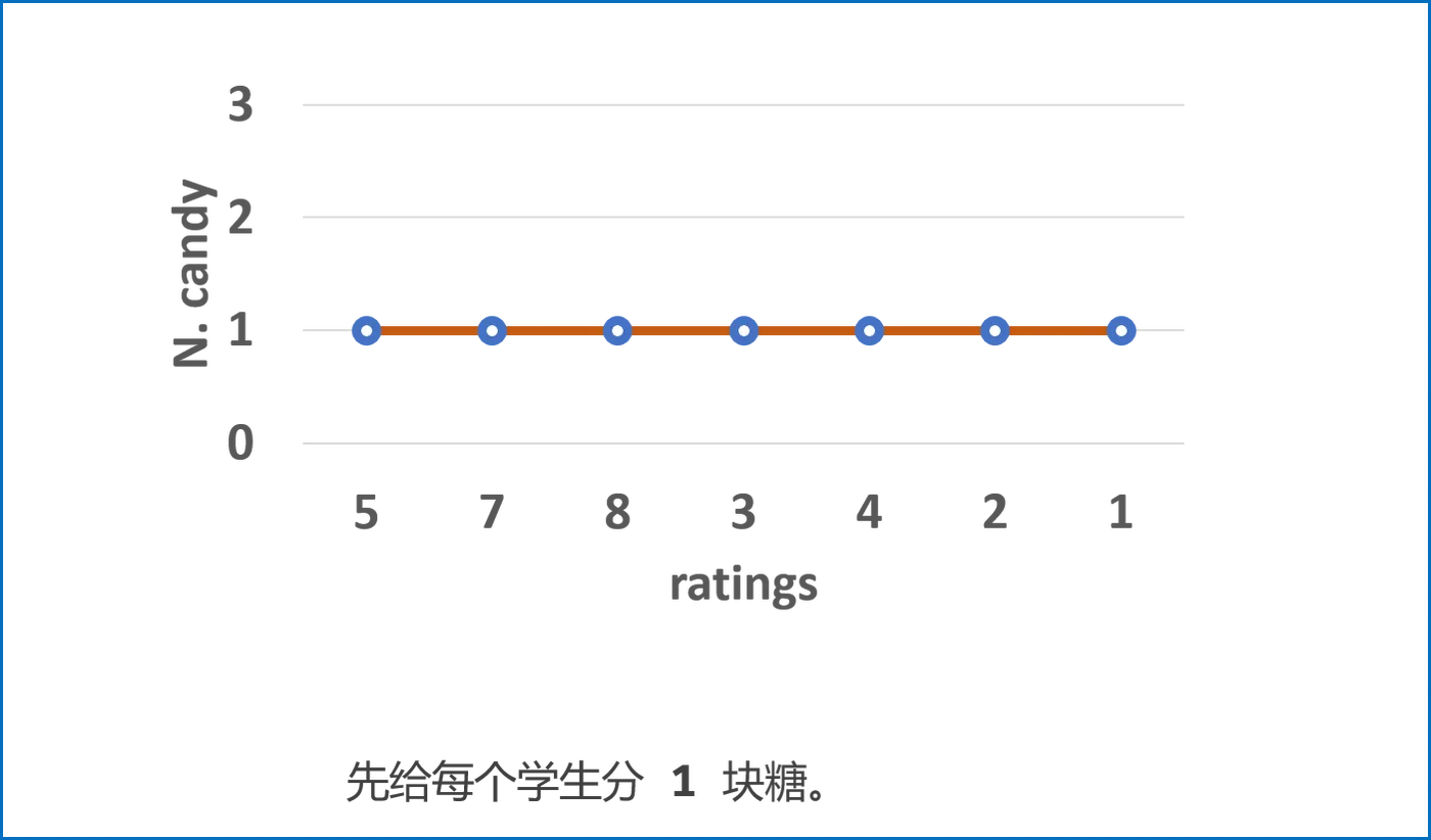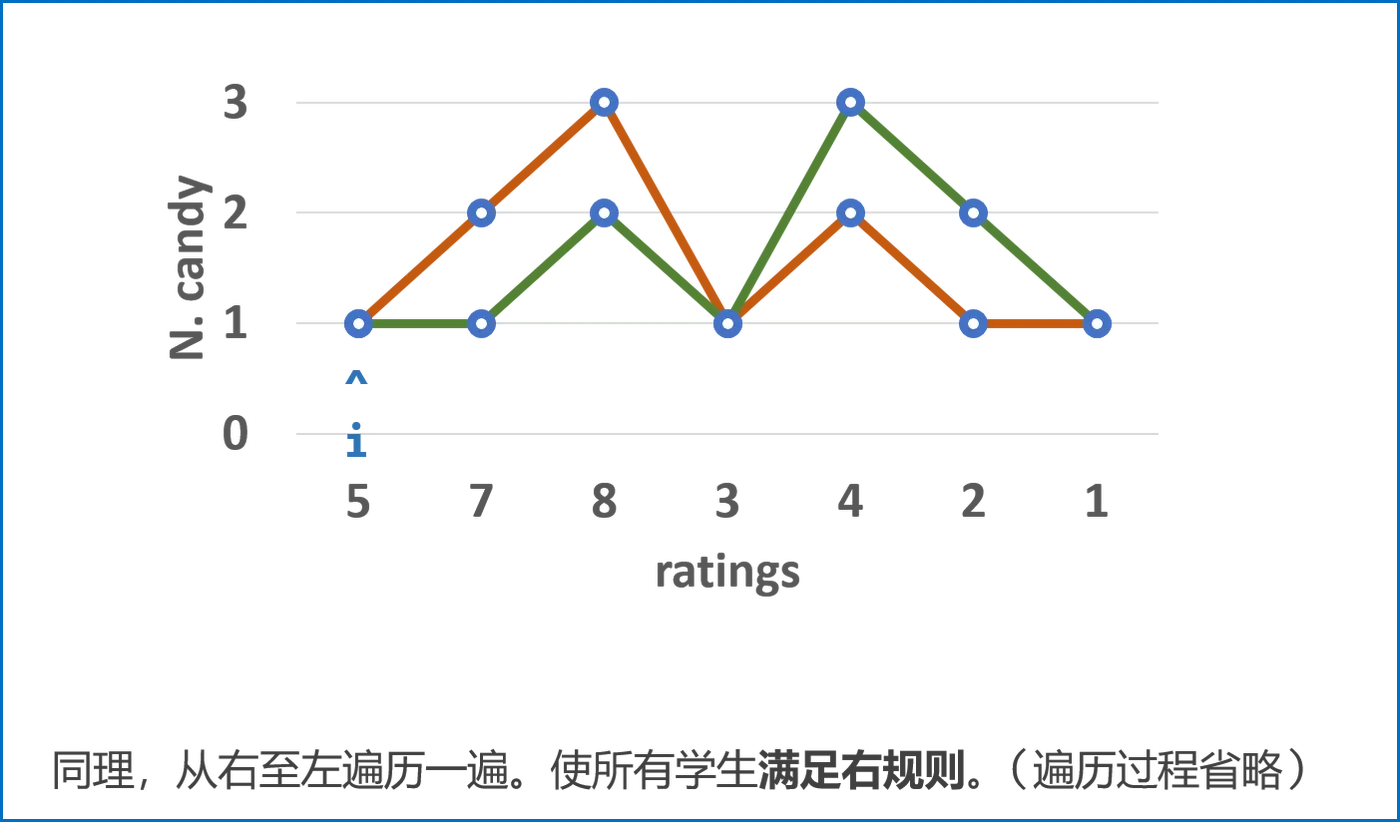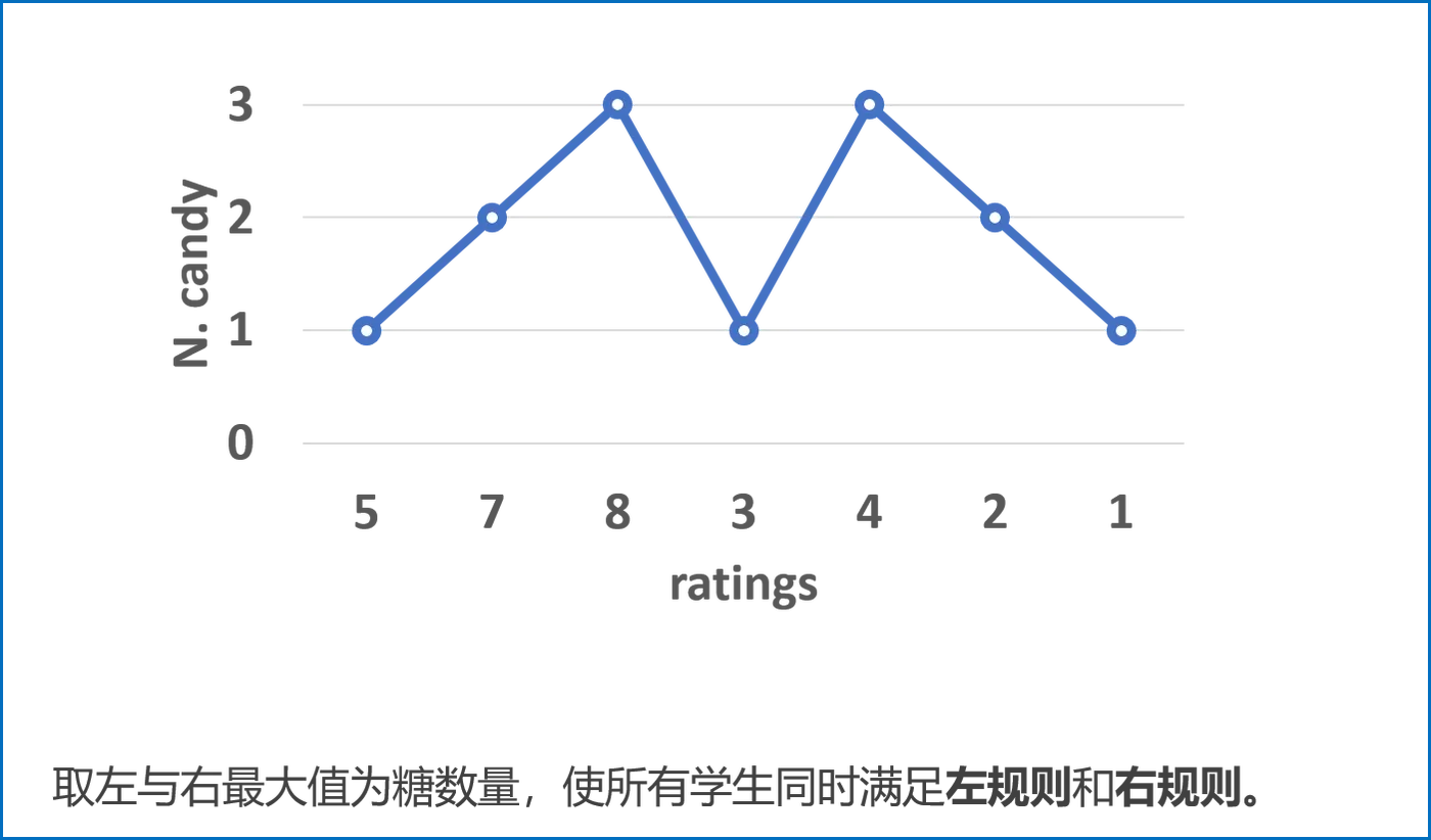 遍历数组2次,分别求满足左规则和右规则时,最少要分得的糖果数量。最终分得糖果数量即为这两个数量最大值。