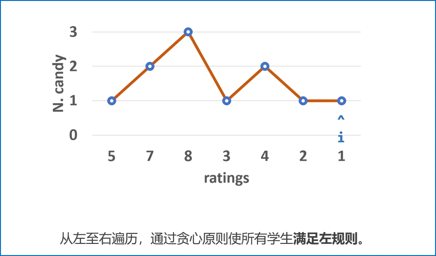 贪心策略:在每次遍历中,只考虑并更新相邻一侧的大小关系。