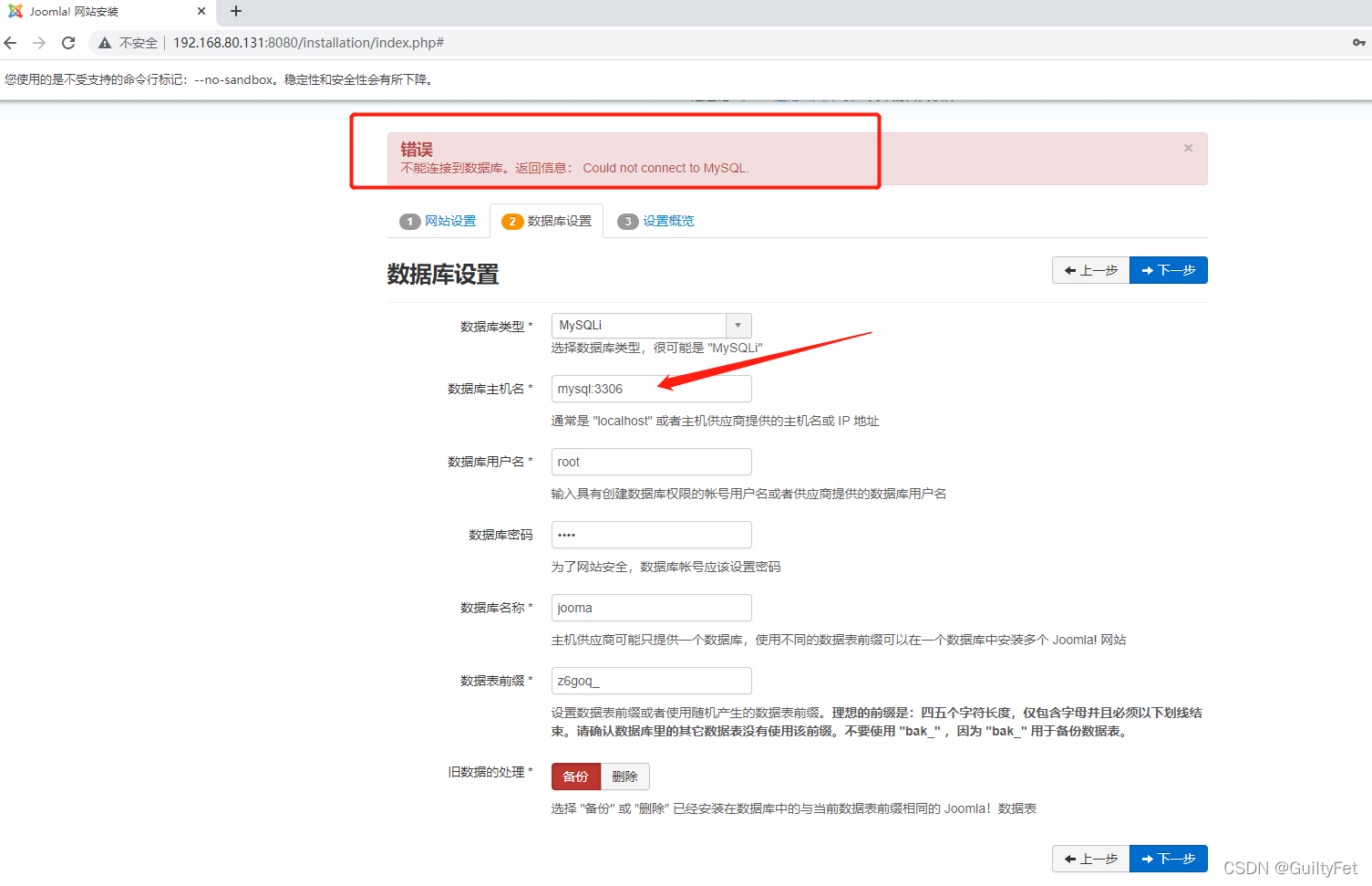数据库地址注意要不出现不能连接到数据库。返回信息: Could not connect to MySQL.