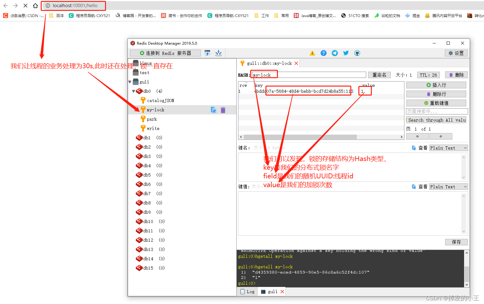 @ResponseBody @GetMapping("/hello") public String hello(){ // 1.获取一把锁,只要锁名字一样,就是同一把锁 RLock lock = redisson.getLock("my-lock"); // 2. 加锁 lock.lock();// 阻塞试等待 默认加的都是30s // 带参数情况 // lock.lock(10, TimeUnit.SECONDS);// 10s自动解锁,自动解锁时间一定要大于业务的执行时间。 try { System.out.println("加锁成功" + Thread.currentThread().getId()); Thread.sleep(30000); } catch (InterruptedException e) { e.printStackTrace(); } finally { // 3. 解锁 System.out.println("解锁成功:" + Thread.currentThread().getId()); lock.unlock(); } return "hello"; }