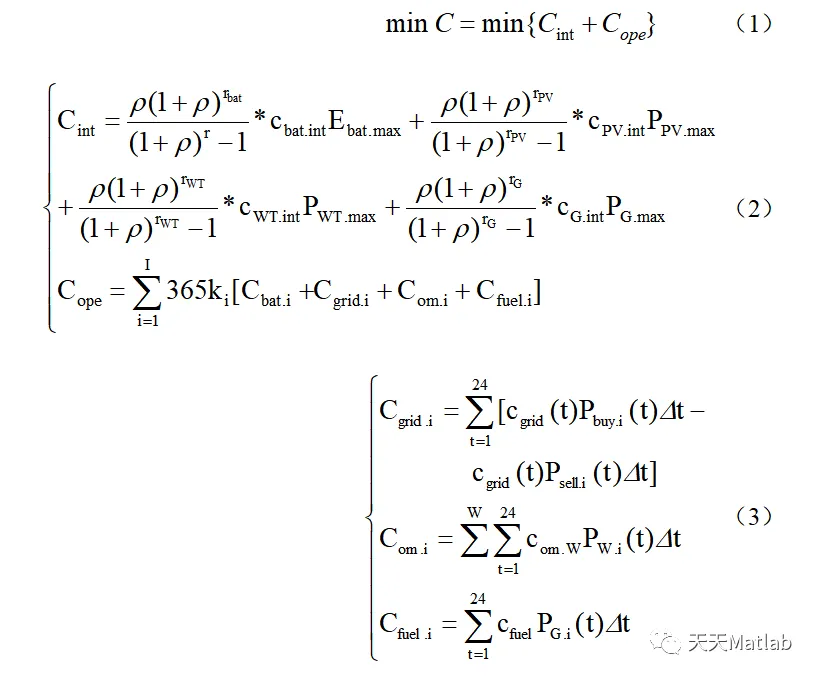 目标函数主要考虑了投资成本和运行成本两部分,其中,投资成本主要为储能的等年值投资成本,运行成本则包括配电网交互成本(购售电成本)、各单元运维成本以及微型燃气轮机的燃料成本。