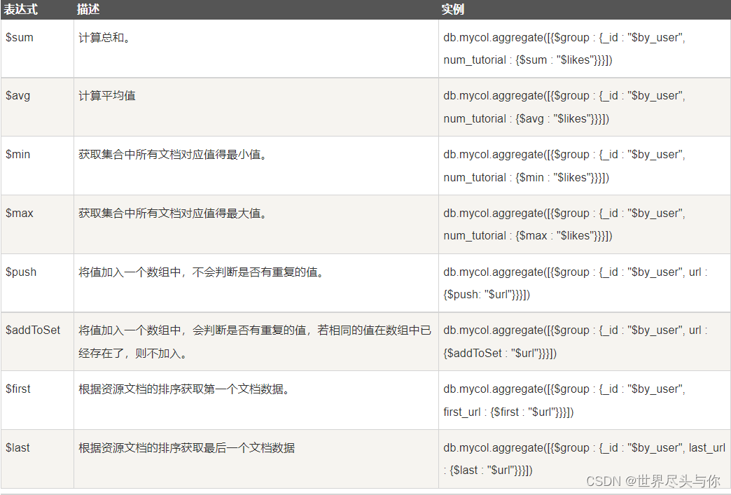 下表展示了一些聚合的表达式: