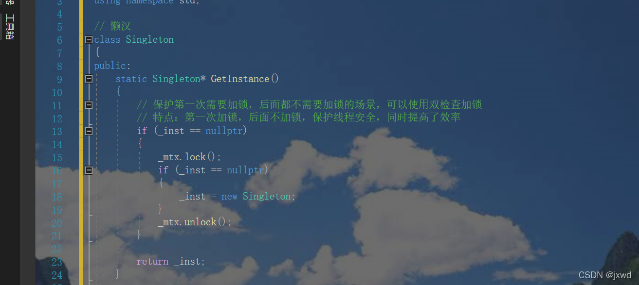 即一个线程刚刚执行到_inst = new Singleton的时候,另外的线程if的条件判断完毕了,但此时的_inst仍然为空,所以第二个进程也就进来了。这样,我们的对象就不仅仅创建了一个了,就与单例模式就相悖了。