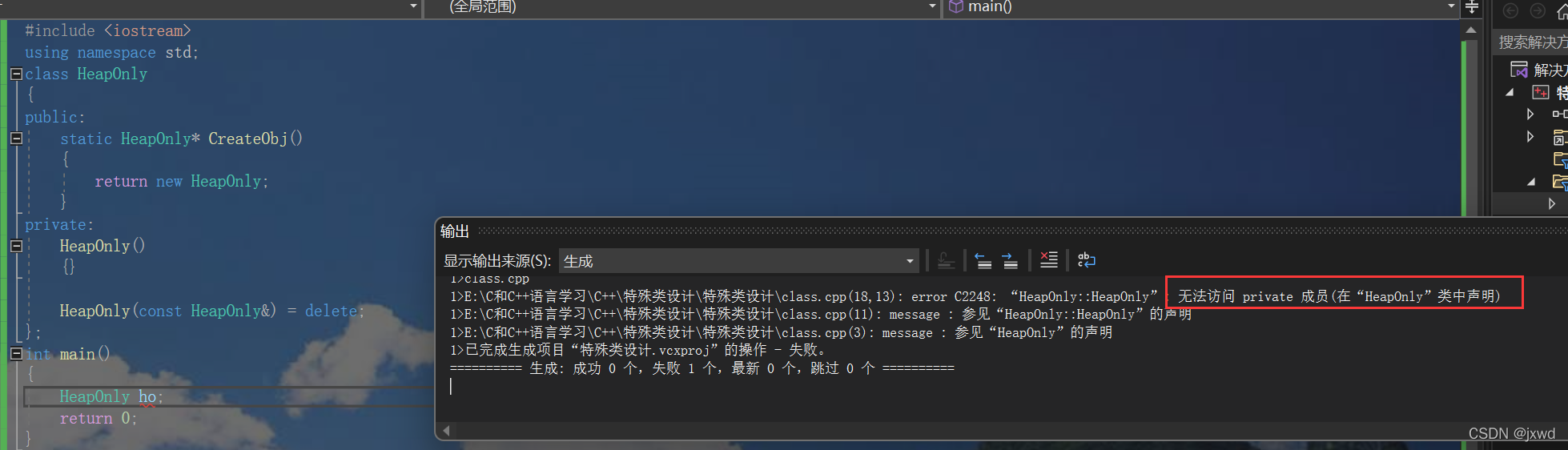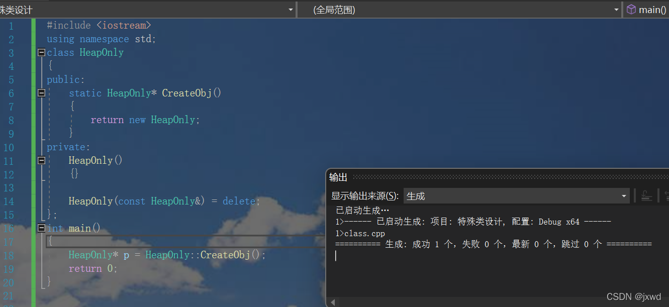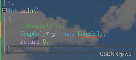 #include <iostream> using namespace std; class HeapOnly { public: static HeapOnly* CreateObj() { return new HeapOnly; } private: HeapOnly() {} HeapOnly(const HeapOnly&) = delete; };