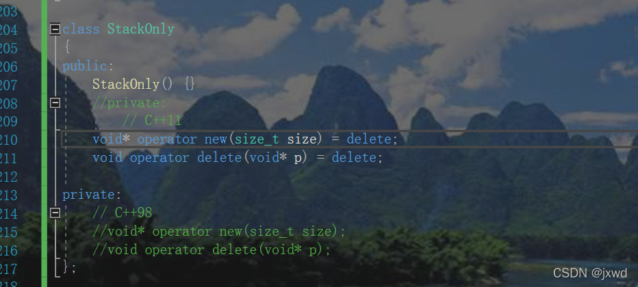 class StackOnly { public: StackOnly() {} //private: // C++11 void* operator new(size_t size) = delete; void operator delete(void* p) = delete; private: // C++98 //void* operator new(size_t size); //void operator delete(void* p); };