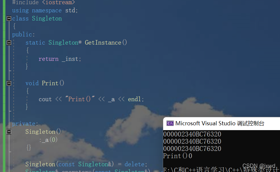 #include <iostream> using namespace std; class Singleton { public: static Singleton* GetInstance() { return _inst; } void Print() { cout << "Print()" << _a << endl; } private: Singleton() :_a(0) {} Singleton(const Singleton&) = delete; Singleton& operator=(const Singleton&) = delete; int _a; static Singleton* _inst; }; Singleton* Singleton::_inst = new Singleton; int main() { cout << Singleton::GetInstance() << endl; cout << Singleton::GetInstance() << endl; cout << Singleton::GetInstance() << endl; Singleton::GetInstance()->Print(); return 0; }
